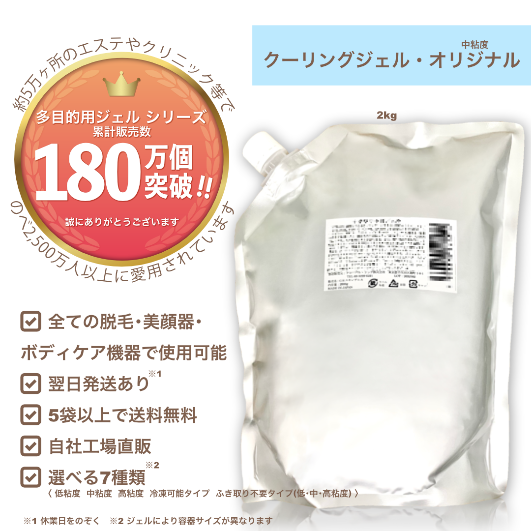 クーリングジェル・オリジナル(中粘度)2kg/袋 脱毛用ジェル 超音波用ジェル 脱毛ジェル 光脱毛ジェル IPL LED EMS SHR等