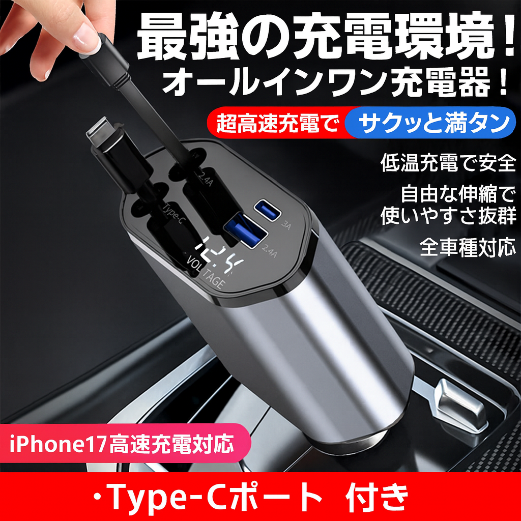 シガーソケット usb カーチャージャー 急速 充電器 車用 iphone typec lightning スマホ 巻き取り リール式 伸縮ケーブル