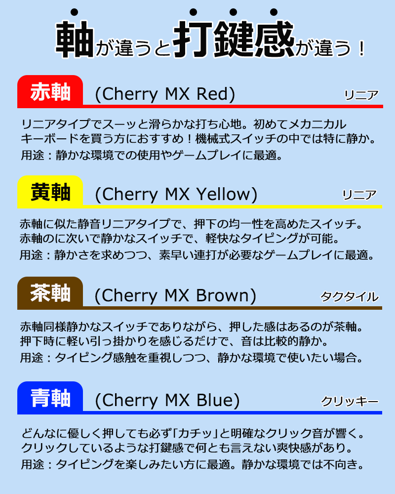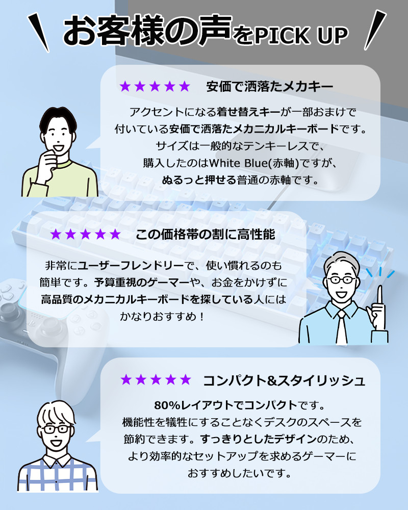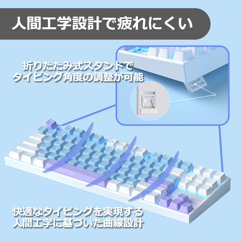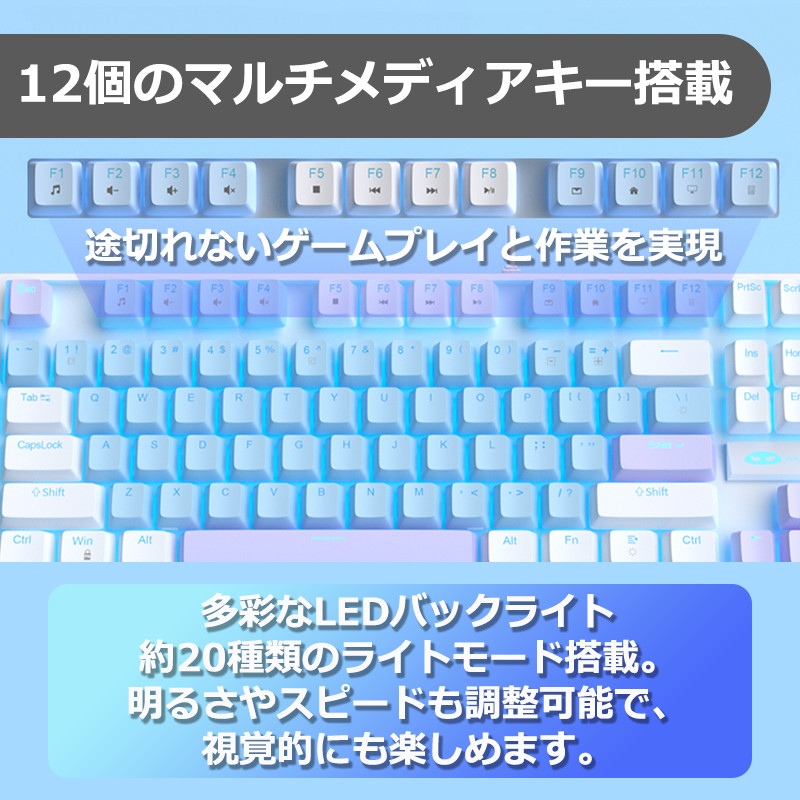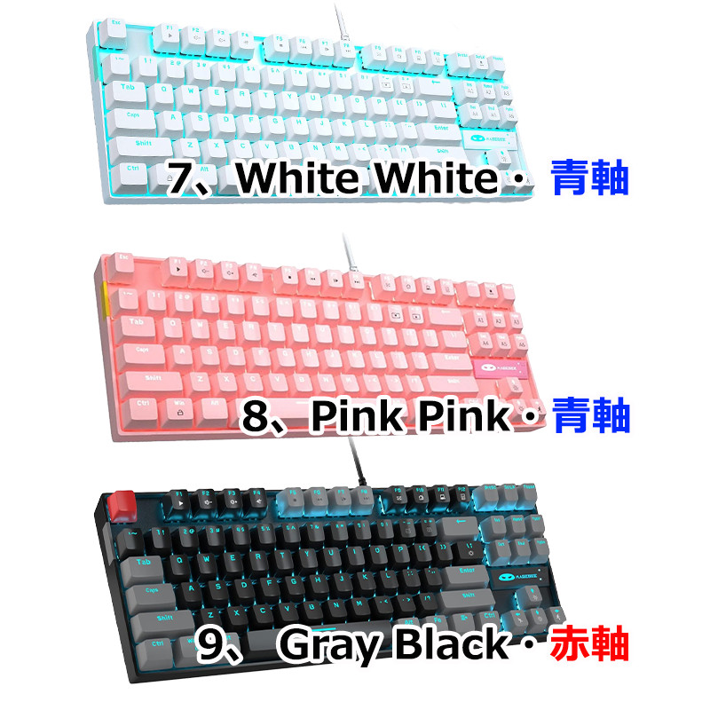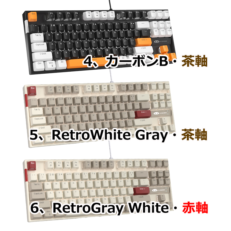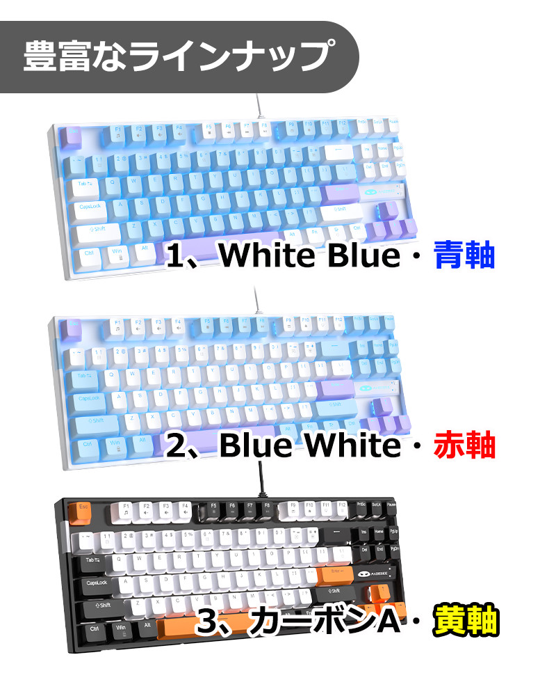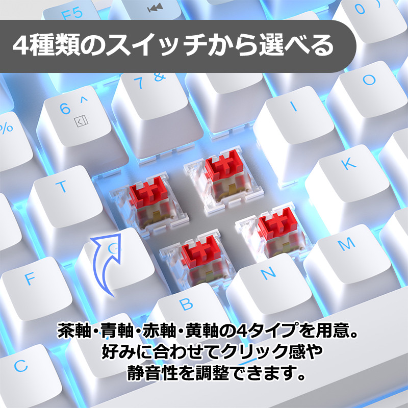 ◎省スペースで実用的!小型サイズながら、矢印キーやF1-F12キー、さらにテンキーを省いた87キーのフルアンチゴーストキーボード。ゲームや仕事はもちろん、多機能利用にも快適に使えます4種類のスイッチから選べる!茶軸・青軸・赤軸・黄軸の4タイプを用意。好みに合わせてクリック感や静音性を調整できます。