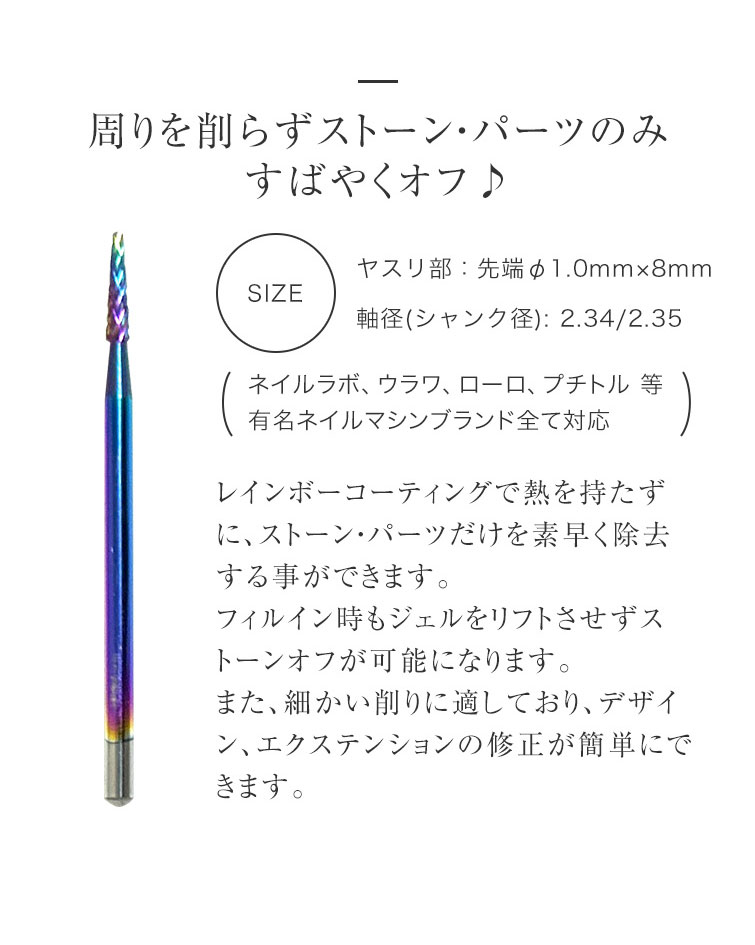 | 商品説明 | レインボーコーティングで熱を持たずに、ストーン・パーツだけを素早く除去する事ができます。 フィルイン時もジェルをリフトさせずストーンオフが可能になります。 また、細かい削りに適しており、デザイン、エクステンションの修正が簡単にできます。 2.34 or 2.35 軸(ネイルラボ、ウラワ、ローロ、プチトル 等 有名ネイルマシンブランド全て対応) |