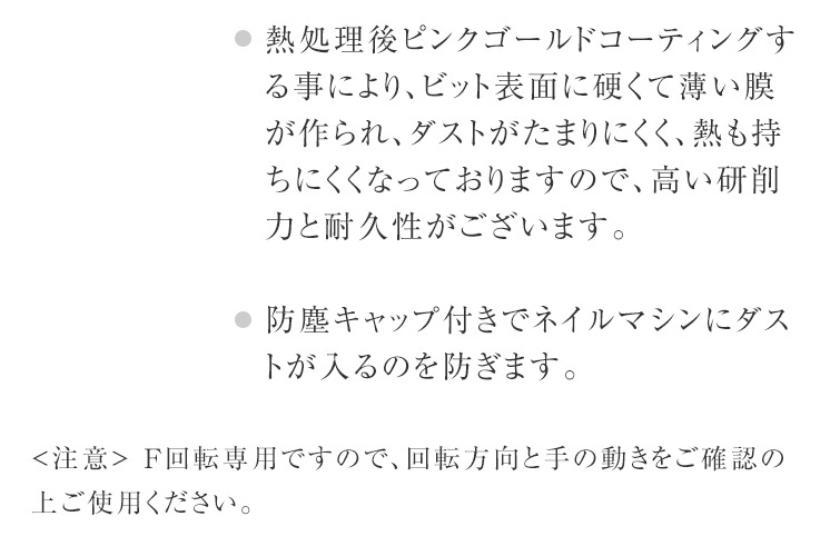 | 商品説明 | ・最高級タングステンから作り出したファイブエクストラコースの幅広かつシャープな刃が、圧倒的なスピードで一気にジェルを削り落とします。 ・一度に削れる削りカスが大きいので、ダストの飛散も防止できます。 ・熱処理後ピンクゴールドコーティングする事により、ビット表面に硬くて薄い膜が作られ、ダストがたまりにくく、熱も持ちにくくなっておりますので、高い研削力と耐久性がございます。 ・防塵キャップ付きでネイルマシンにダストが入るのを防ぎます。 <注意> F回転専用ですので、回転方向と手の動きをご確認の上ご使用ください。 2.34 or 2.35 軸(ネイルラボ、ウラワ、ローロ、プチトル 等 有名ネイルマシンブランド全て対応) |