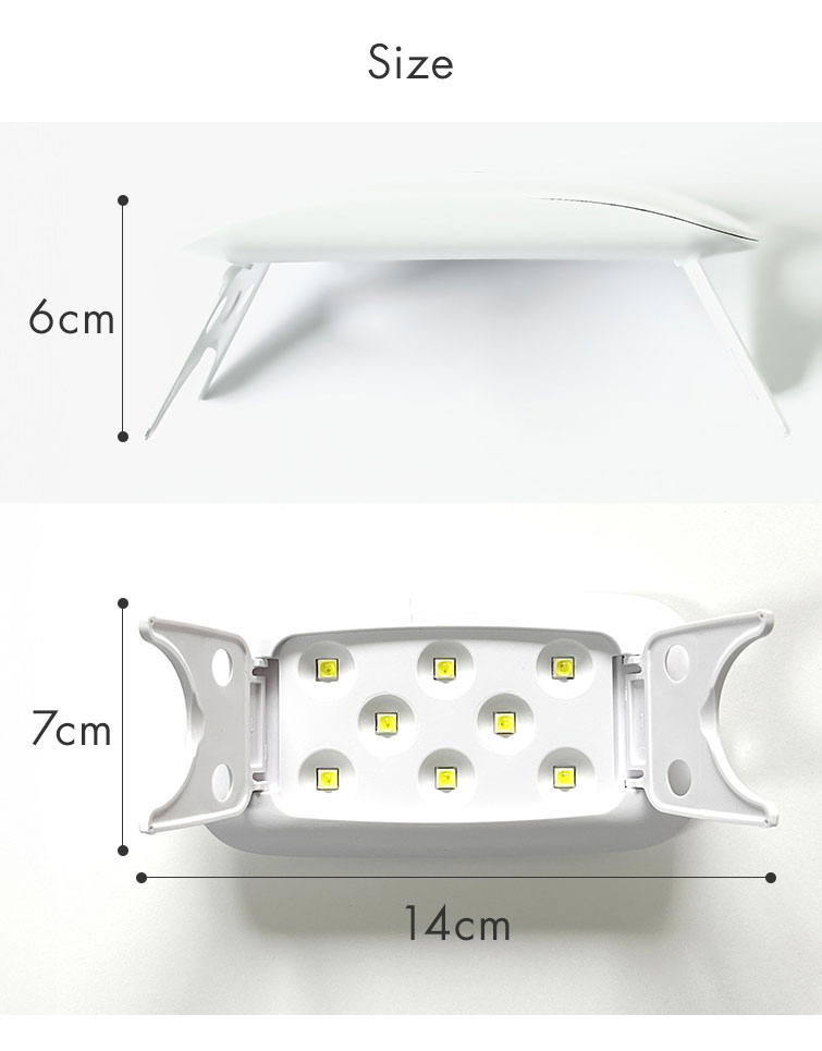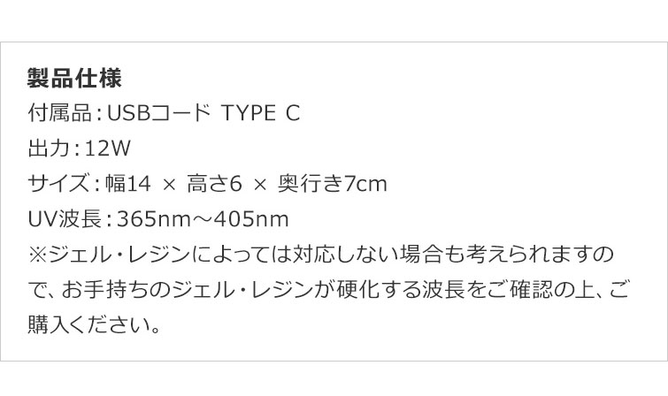 | 製品仕様 | 付属品:USBコード TYPE C 出力:12W サイズ:幅14 × 高さ6 × 奥行き7cm UV波長:365nm〜405nm ※ジェル・レジンによっては対応しない場合も考えられますので、お手持ちのジェル・レジンが硬化する波長をご確認の上、ご購入ください。 |