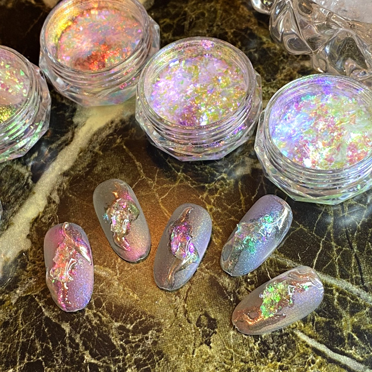 透明感のあるオーロラネイルに大活躍するオーロラ色フレーク。