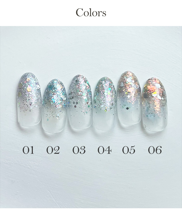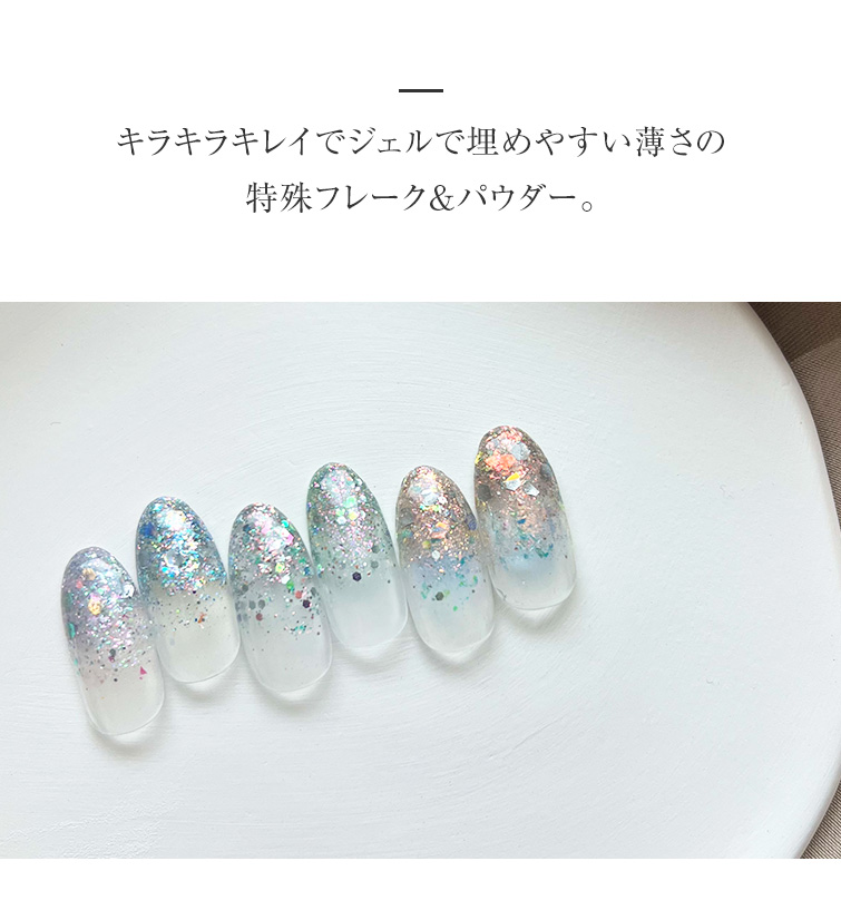 商品説明:キラキラキレイでジェルで埋めやすい薄さの特殊フレーク&パウダー。