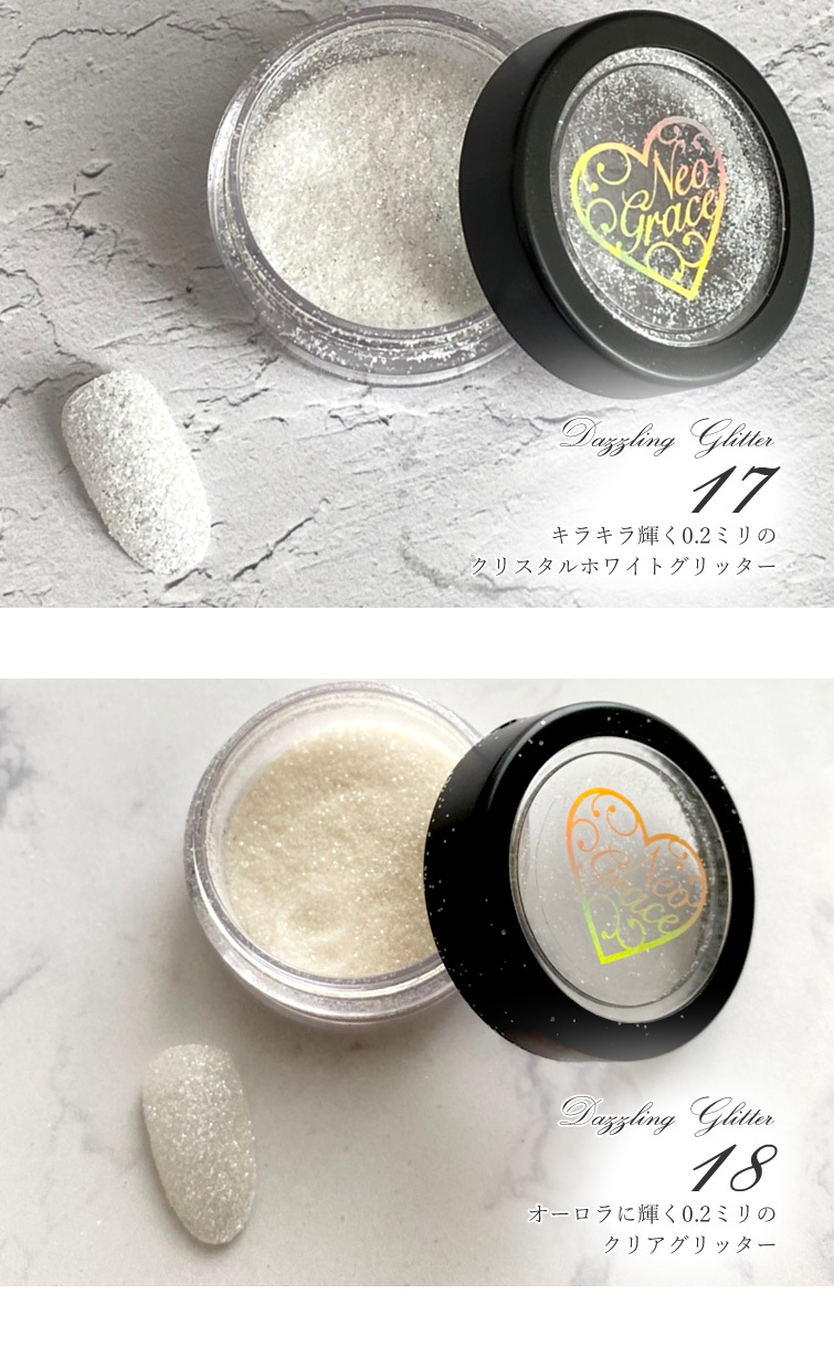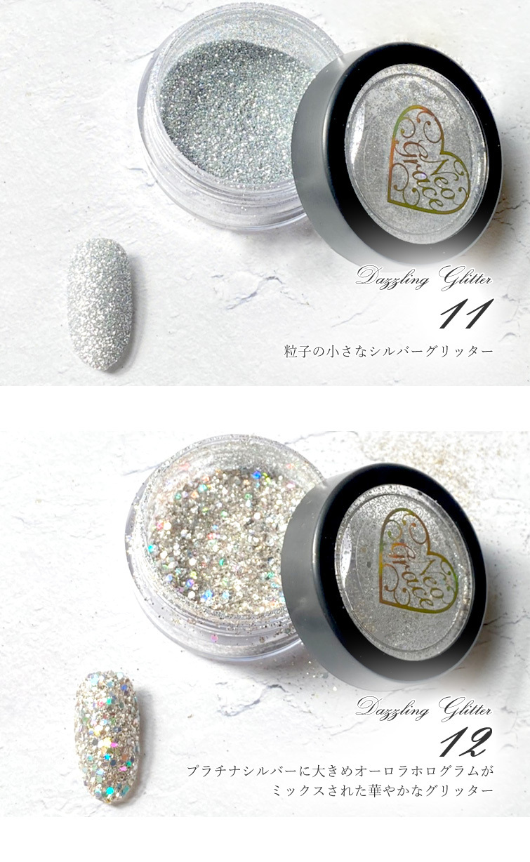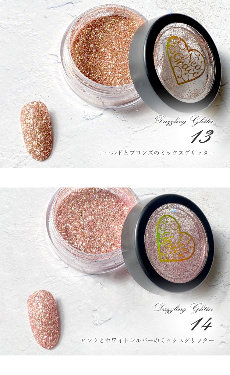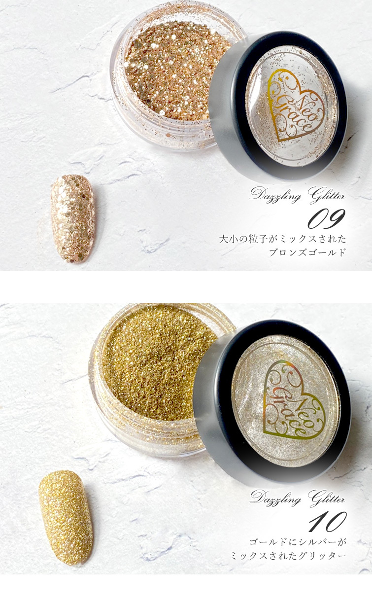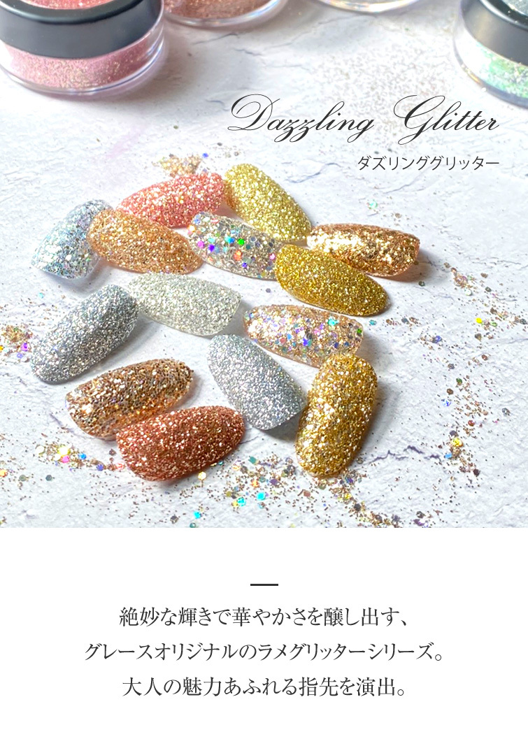 絶妙な輝きで華やかさを醸し出す、グレースオリジナルのラメグリッターシリーズ。大人の魅力あふれる指先を演出。