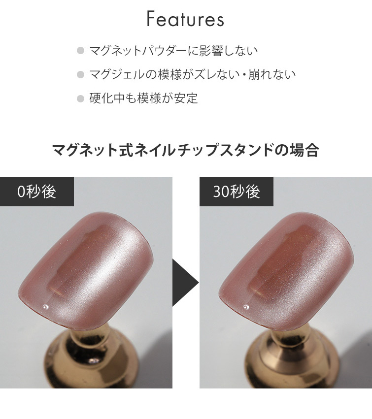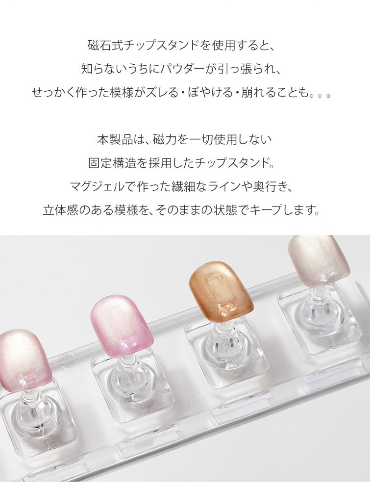 | 商品説明 | 磁石式チップスタンドを使用すると、知らないうちにパウダーが引っ張られ、 せっかく作った模様がズレる・ぼやける・崩れることも。。。 本製品は、磁力を一切使用しない固定構造を採用したチップスタンド。 マグジェルで作った繊細なラインや奥行き、立体感のある模様を、そのままの状態でキープします。 「なぜ今まで気づかなかったのか」 そう思わせる、マグジェル時代の新定番です。 特長 ・マグネットパウダーに影響しない ・マグジェルの模様がズレない・崩れない ・硬化中も模様が安定 |