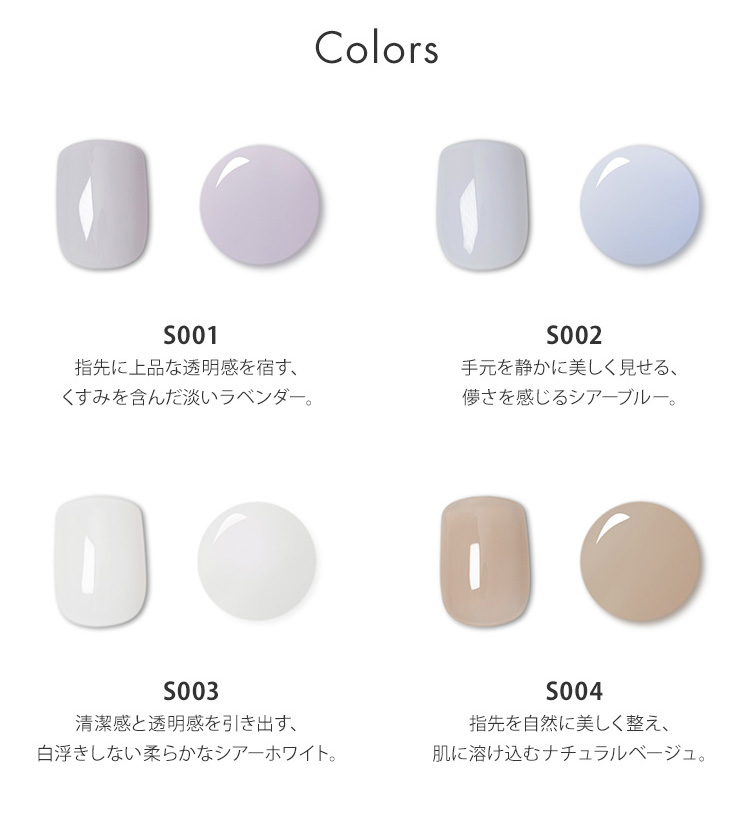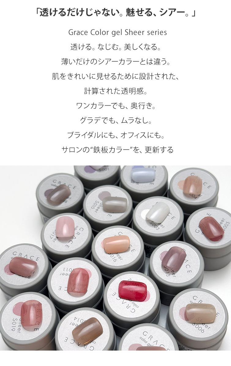ムラになりにくい 透け感のあるシアーカラージェル TPOフリーHEMAフリー グレースカラージェル シアーシリーズ S001 S002 S003 S004 S005 S006 S007 S008 S009 S010 S011 S012 S013 S014 S015 S016 S017 S018 S019