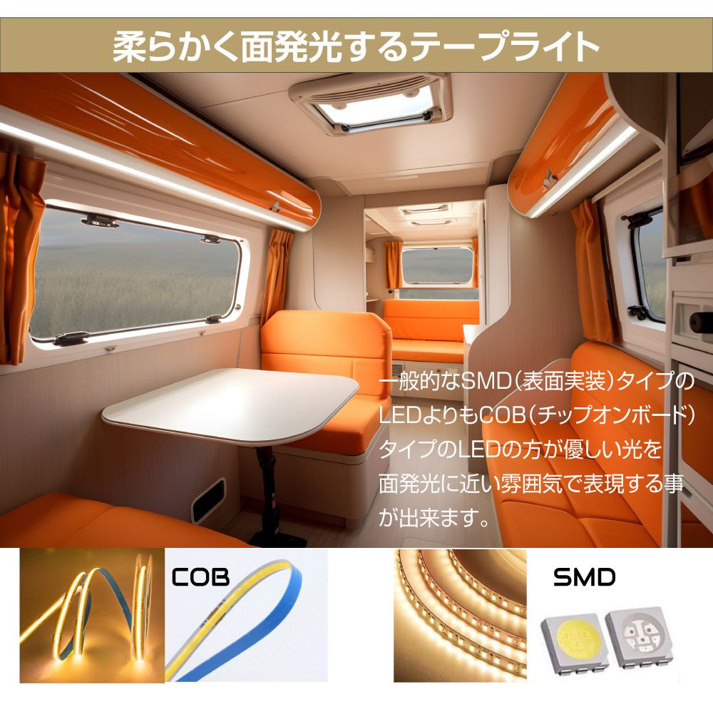 | 特徴 | キャンピングカーの車内照明に採用されるDC12V用のLEDテープライトです。 COB(チップオンボード)タイプなので、一般的な点で発行するテープライトより淡く優しい光を放ちます。 棚やテーブルの隙間に隠して発光させることで間接照明として使用することができます。 25mm毎の接点ラインをカットすることにより長さが調整可能です。 |