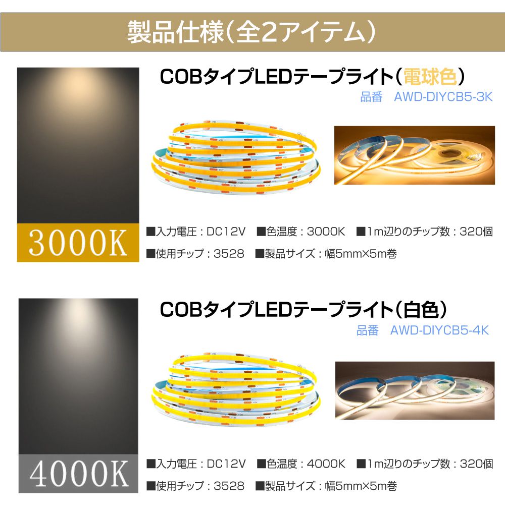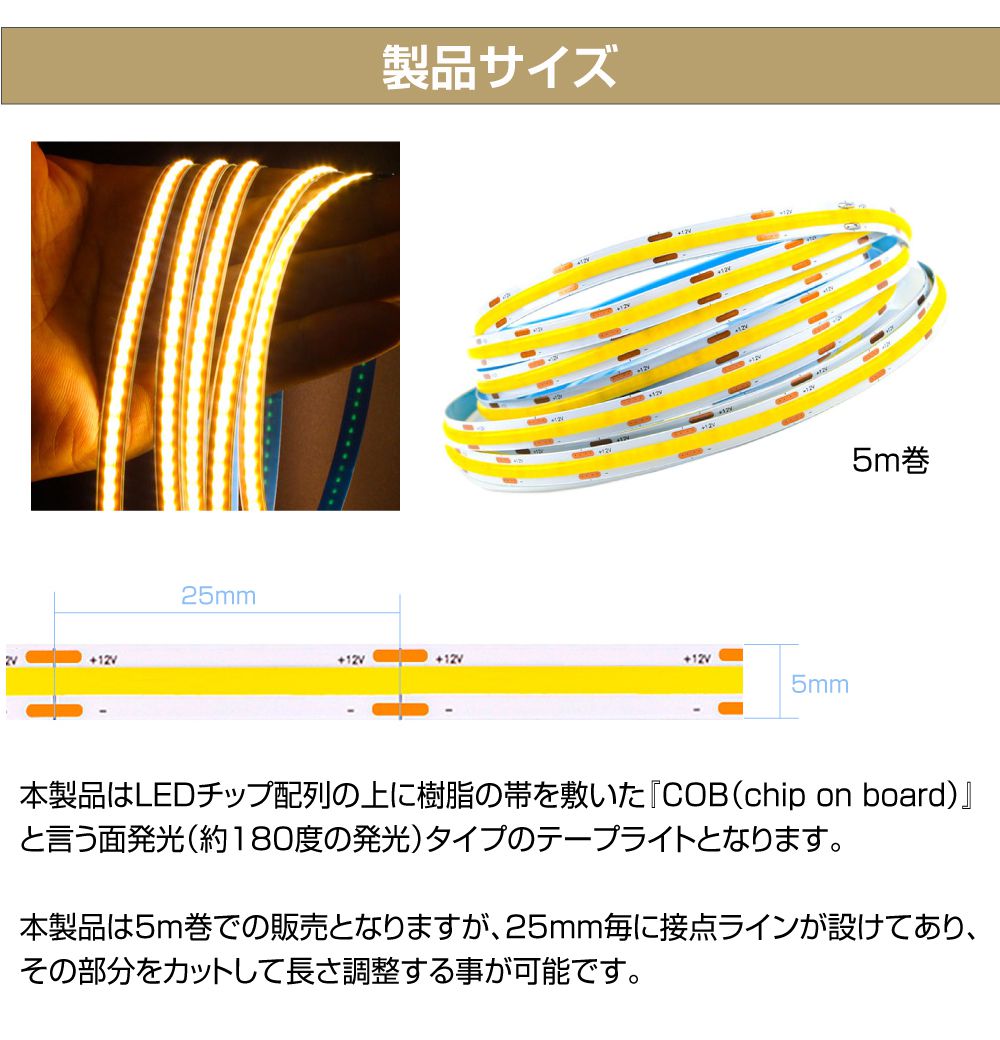 | 商品名 | DC12V用 LEDテープライト 5m巻 幅5mm(COB)全2タイプ |
