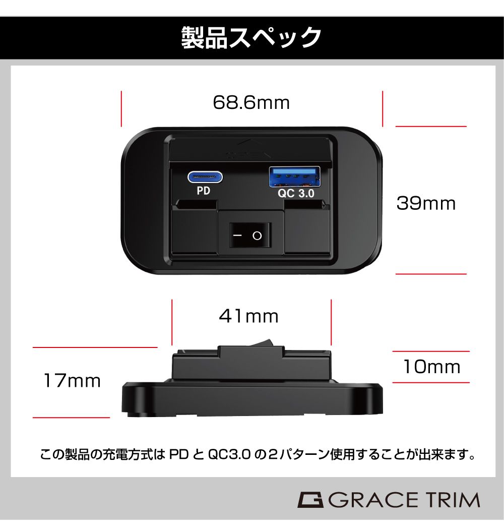 | 特徴 | ・コンパクトで多機能な埋め込みタイプUSBポートです。 ・タイプC PD/タイプA QC3.0 の急速充電端子を2ポート埋め込むことができます。 ・保護カバー付きでホコリが入りずらいです。 ・オンオフスイッチ付きなのでケーブルを接続したまま機器のオンオフができます。 |