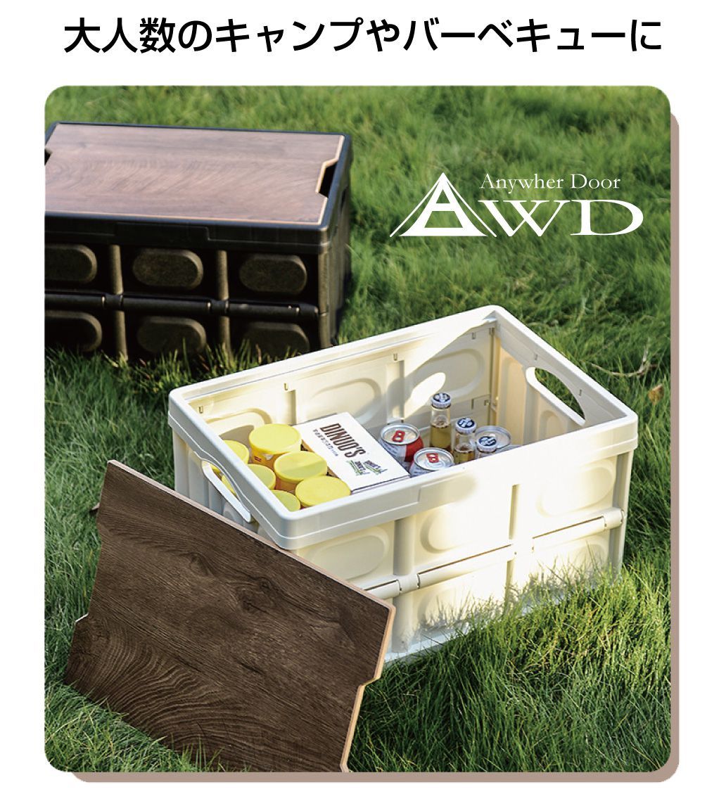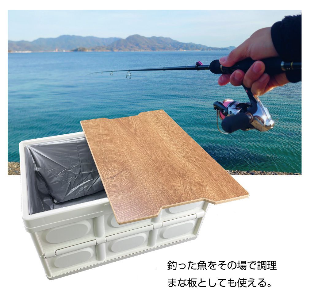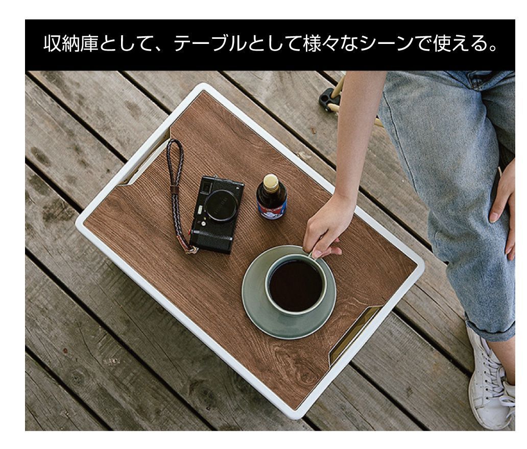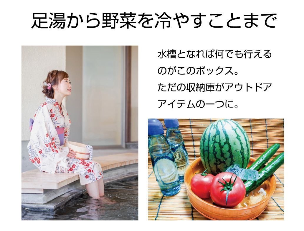 特徴 | ・収納からテーブルまでを一台でこなす、コンテナ型テーブルボックスです。 ・天板蓋が別体となっているので、テーブルとして使用している時でも、天板に置いた物ごと動かすことができるので、取り出しが容易です。 ・付属の防水シートを装着すれば水槽として使用できるので、釣った魚やスイカ・ラムネ等を氷を入れて冷やして置くこともできます。 |