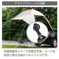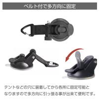 特徴 | アウトドア、キャンプ、車中泊で大活躍のカラビナベルト付きのレバー式の吸盤です。 車を利用したタープ設営はもちろん、アイディア次第で様々な使い方ができます。 |