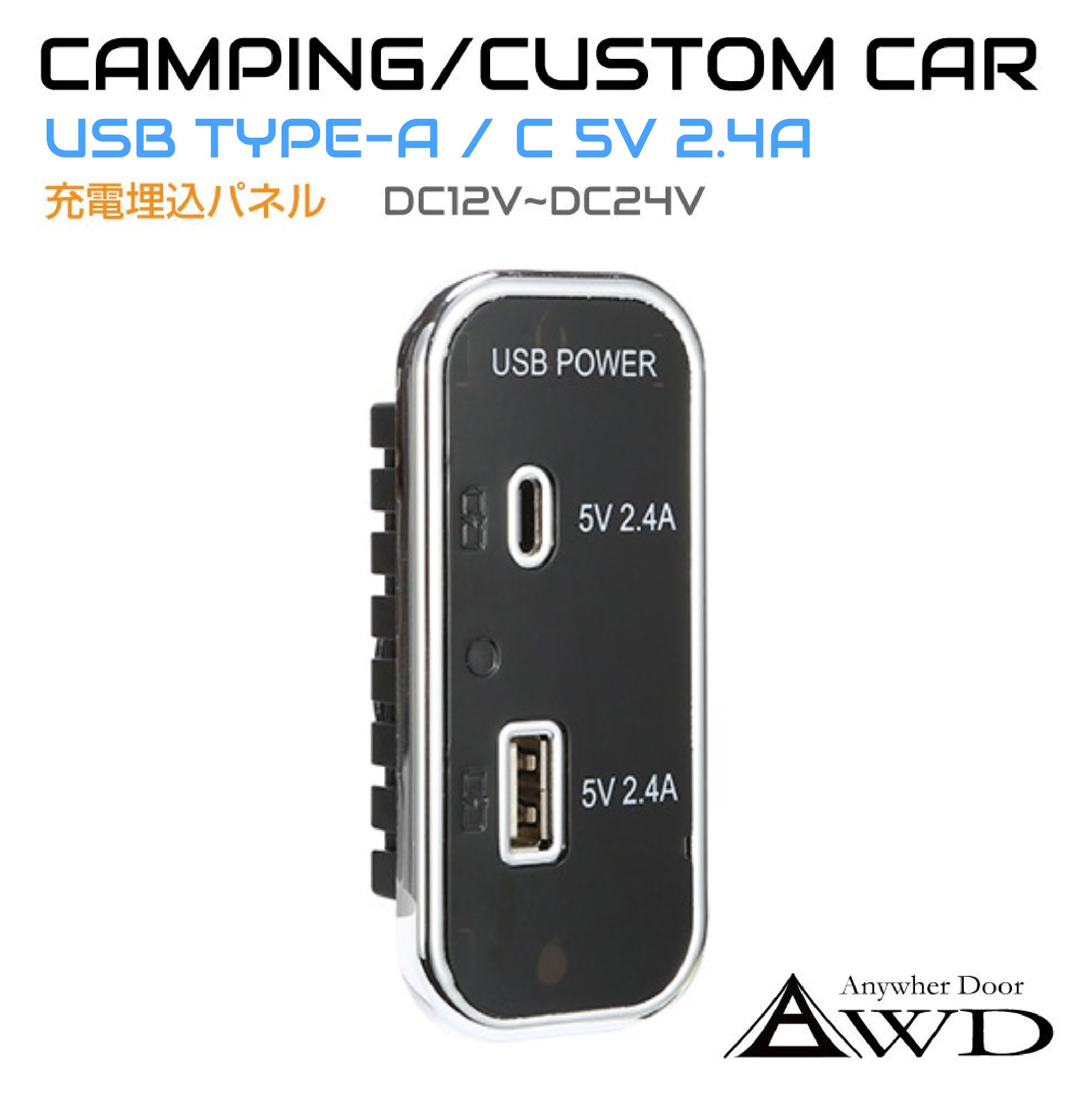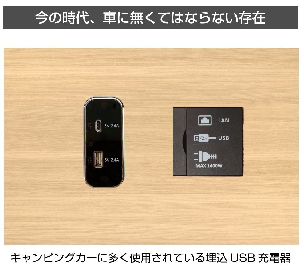 | 特徴 | ・キャンピングカーに多く使用されている埋め込みタイプのUSBポートです。 ・高級感のあるスッキリとしたデザインです。 |