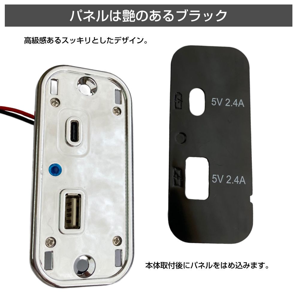 | 商品名 | 縦型 埋込USBパネル タイプ2 ブラック/メッキ USB TYPE-A/C 5V 2.4A |