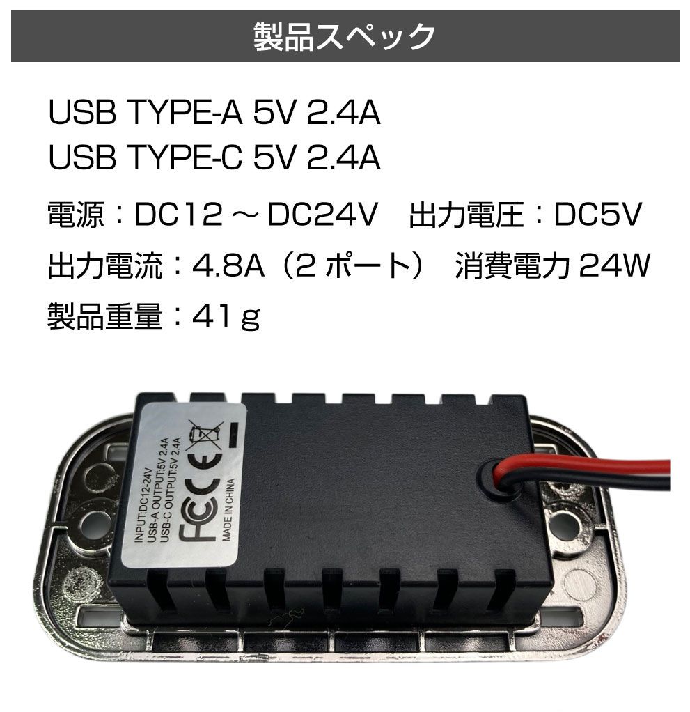 | 仕様 | 電源:DC12V〜DC24V 出力電圧:DC5V 出力電流:4.8A(2ポート) 消費電力:24W 重量:41g |