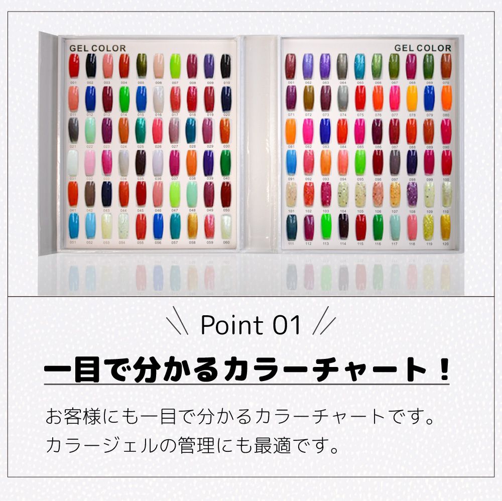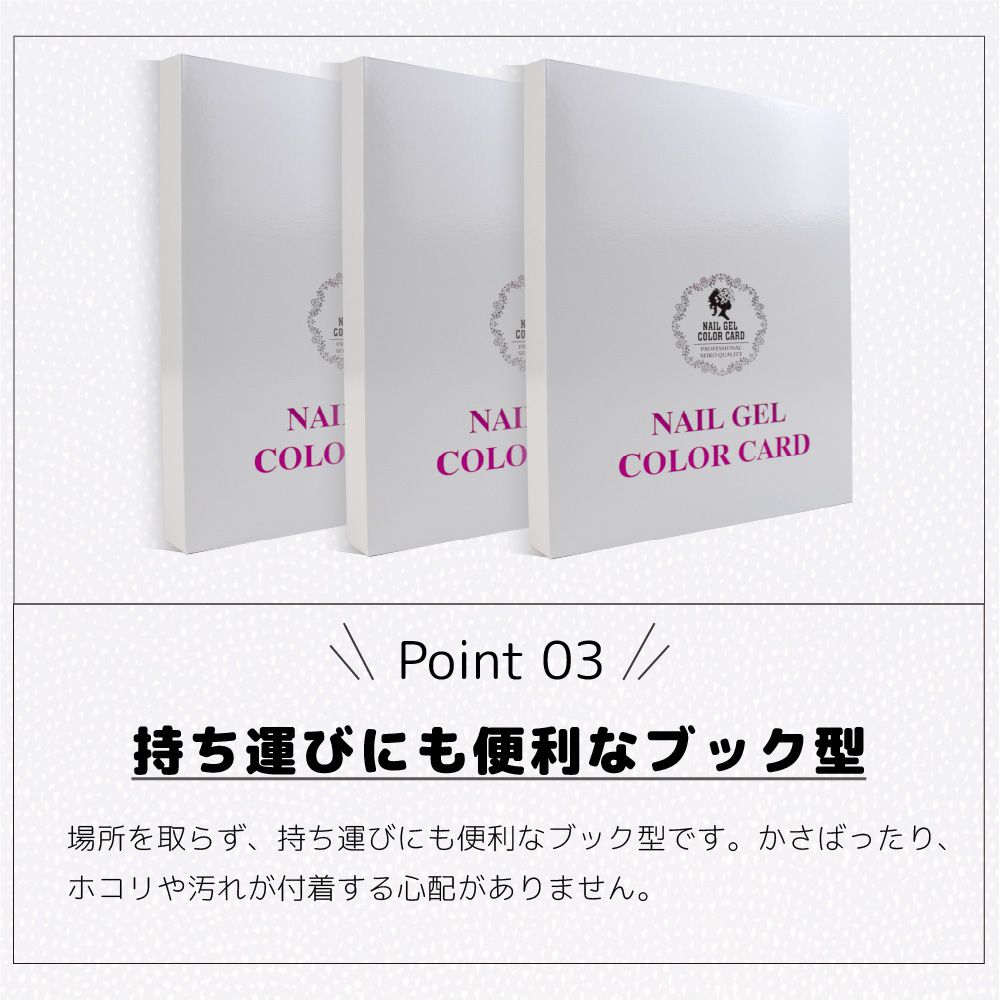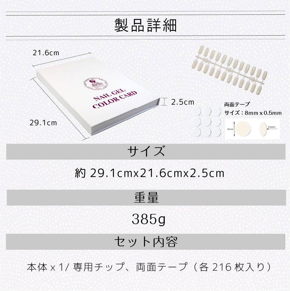 | 特徴 | 216枚の専用チップが付いたネイルカラーチャートブックです。 point1 一目で分かりやすくカラージェルの管理に最適! point2 専用両面テープ付属でしっかり固定! point3 持ち運びにも便利なブック型! |