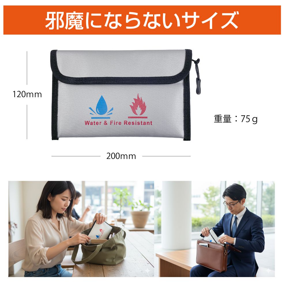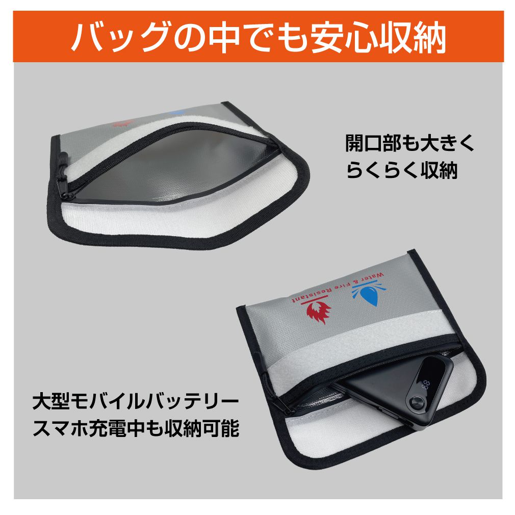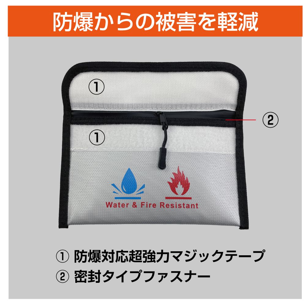 | 特徴 | \耐火・耐熱・防爆 に特化したセーフティポーチです!/ 万が一モバイルバッテリーやバッテリー搭載機器が発火、爆発した場合でも炎や煙を閉じ込めることで被害を最小限に抑えることができます。 防水機能も兼ね備えているので火災や地震、豪雨などの緊急時に、通帳・契約書・保険証券・現金・パスポートなどの大切な貴重品保護にも活躍します。 |