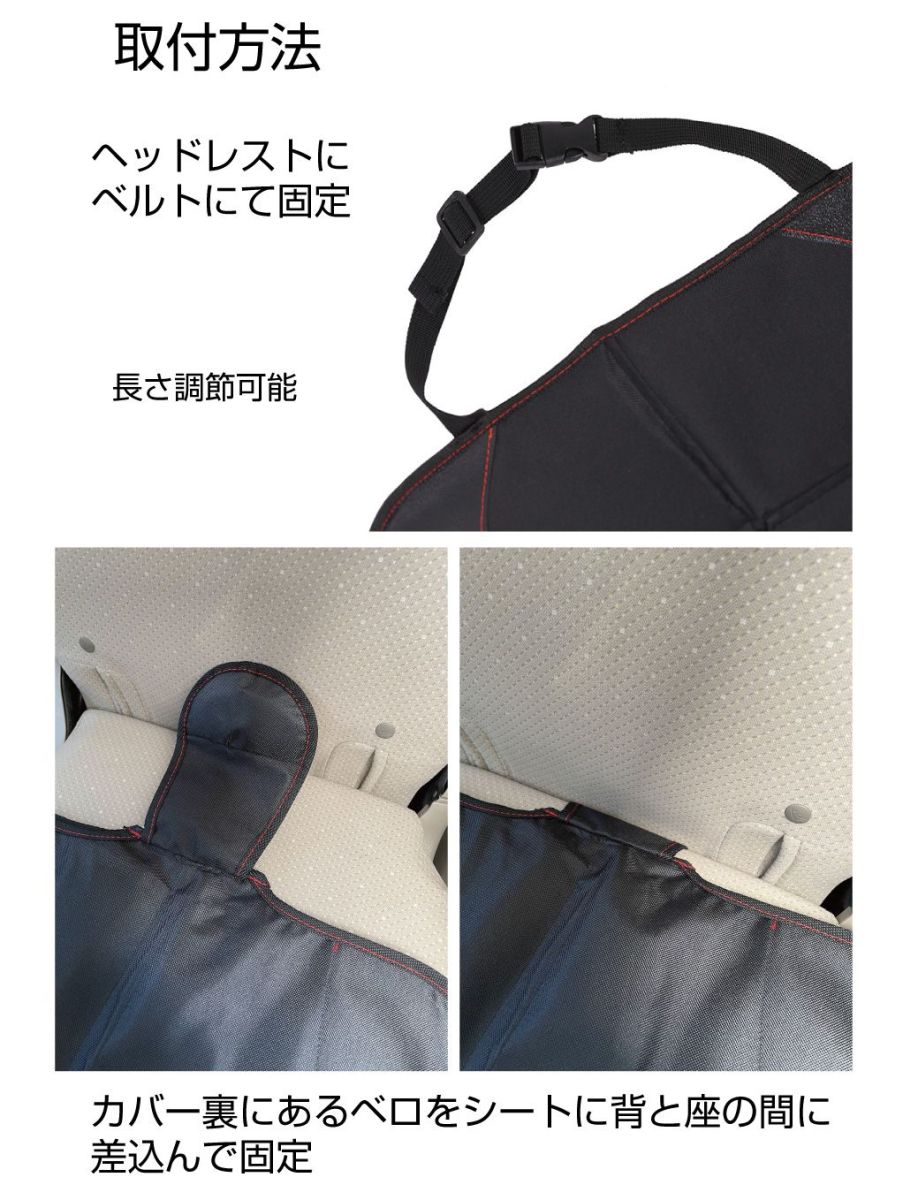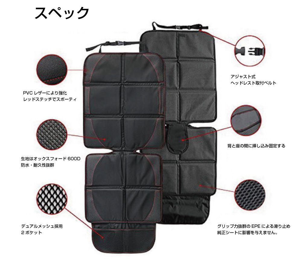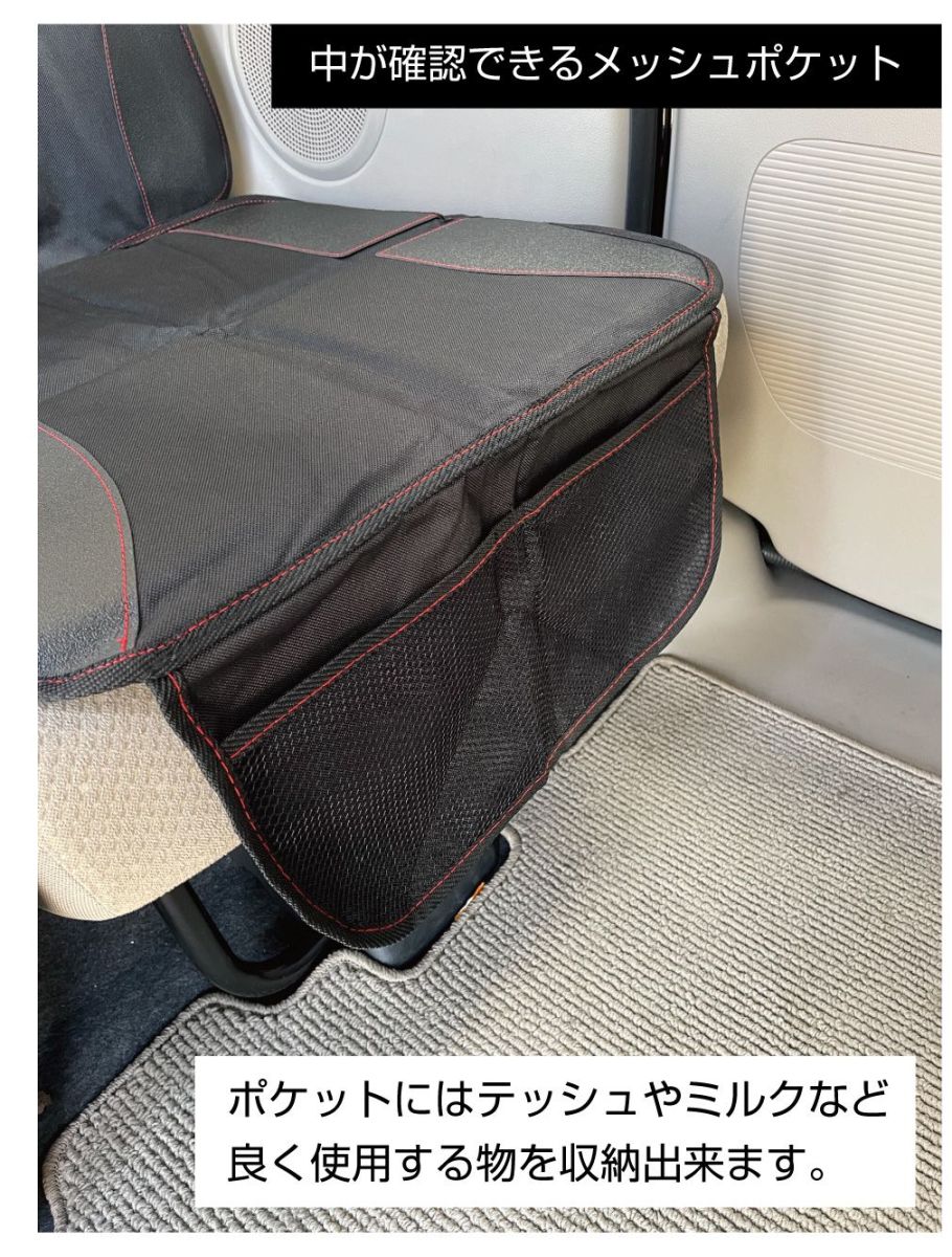 | 特徴 |  ・チャイルドシート取付時の傷や凹み等を緩和する純正用シートの保護カバーです。 ・チャイルドシートは付けた後、子どもが乗らなくなるまで付けっぱなしという事も多く、外してみると純正のシートが大変な事に… ・底面と背面が両方が保護できる1席全面保護カバーなのでしっかりと傷や汚れから守ります。 ・下部にはポケットがあるのでベビー用品の小物等も収納できます。 ・アジャスト式ベルトと座面と背面の間に差し込む簡単取付! ・車の座席サイズに合わせて選べる3サイズをご用意しました。(ご覧の商品はLサイズです。)  |