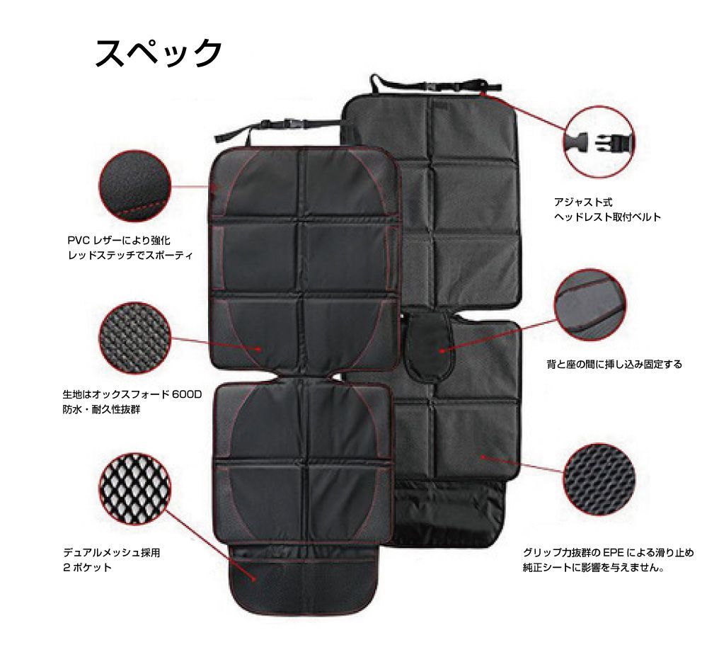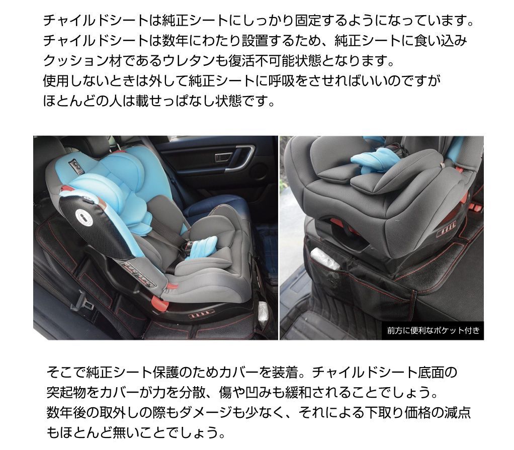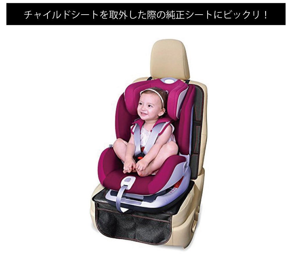 | 特徴 |  ・チャイルドシート取付時の傷や凹み等を緩和する純正用シートの保護カバーです。 ・チャイルドシートは付けた後、子どもが乗らなくなるまで付けっぱなしという事も多く、外してみると純正のシートが大変な事に… ・底面と背面が両方が保護できる1席全面保護カバーなのでしっかりと傷や汚れから守ります。 ・下部にはポケットがあるのでベビー用品の小物等も収納できます。 ・アジャスト式ベルトと座面と背面の間に差し込む簡単取付! ・車の座席サイズに合わせて選べる3サイズをご用意しました。(ご覧の商品はMサイズです。)  |