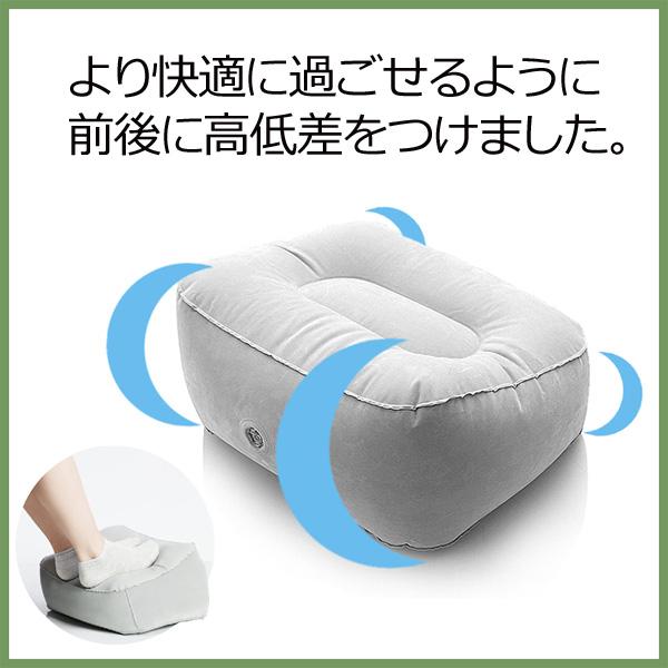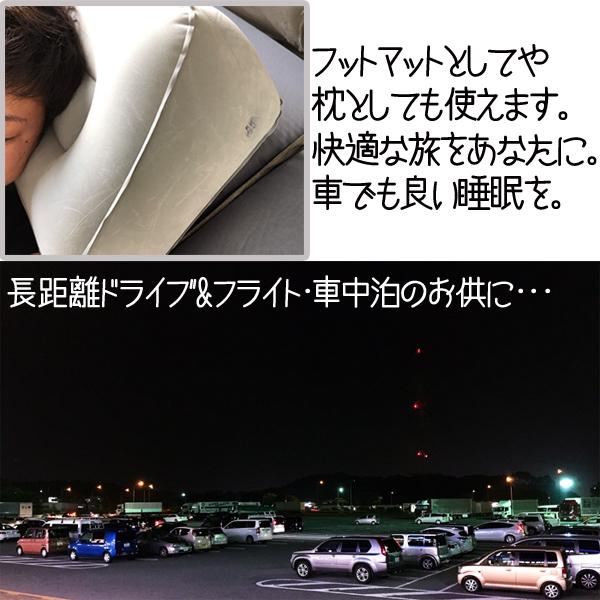 | 特徴 | ・空気を入れるだけで使えるエアークッション! ・使わない時は空気を抜いておけばとてもコンパクトで何処にでも収納できるので場所を取らない! ・長距離のドライブやフライトでずっと座っていると足やお尻等が痛くなったりむれたりして疲れますよね? ・そんな時はこのクッションに足を乗せればリラックスして過ごす事ができる上に、ムレにくく疲れにくい! ・車中泊を伴うドライブの際にはそのまま枕に変身! ・実際に使ってみた感想は「この高さがいい」でした。少し高めの枕が好きな方にはピッタリだと思います! ・前後で高さが違うことによって、寝やすく・足が疲れにくい! |