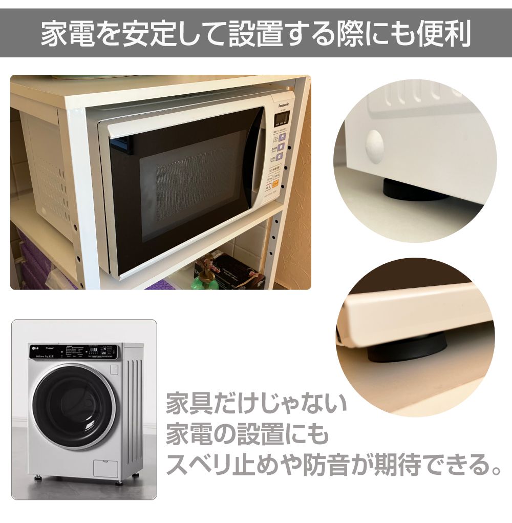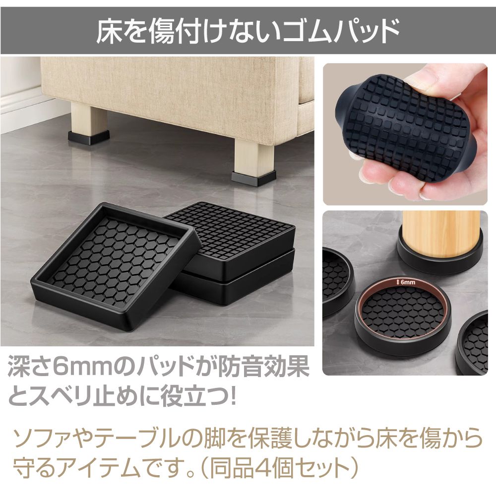 | 特徴 | \床を傷から守るゴムパッド!/ スベリ止めや騒音防止の効果もあります。 家具、家電を安定して設置する際にも便利。 |
