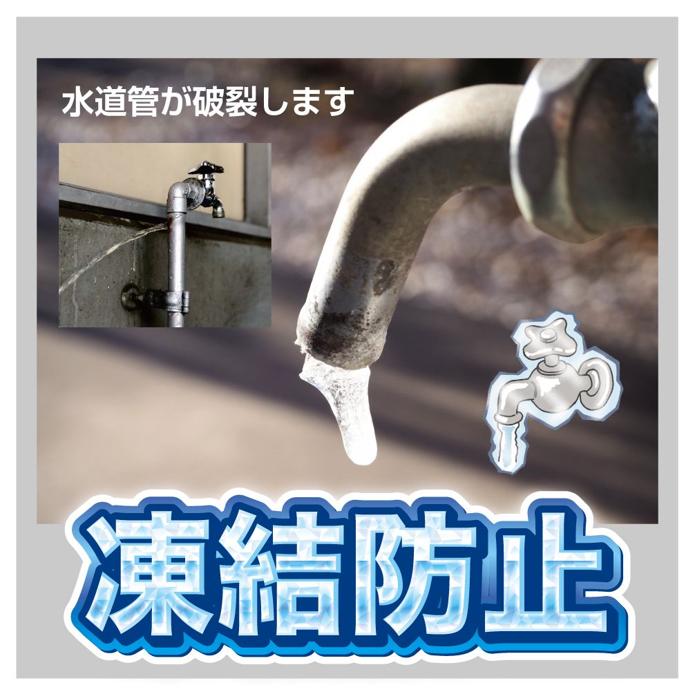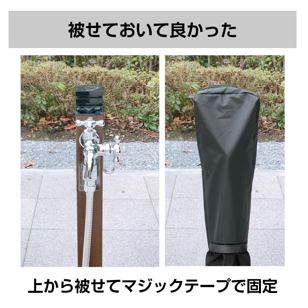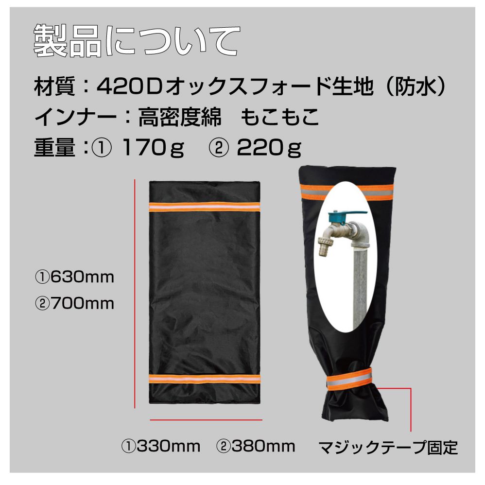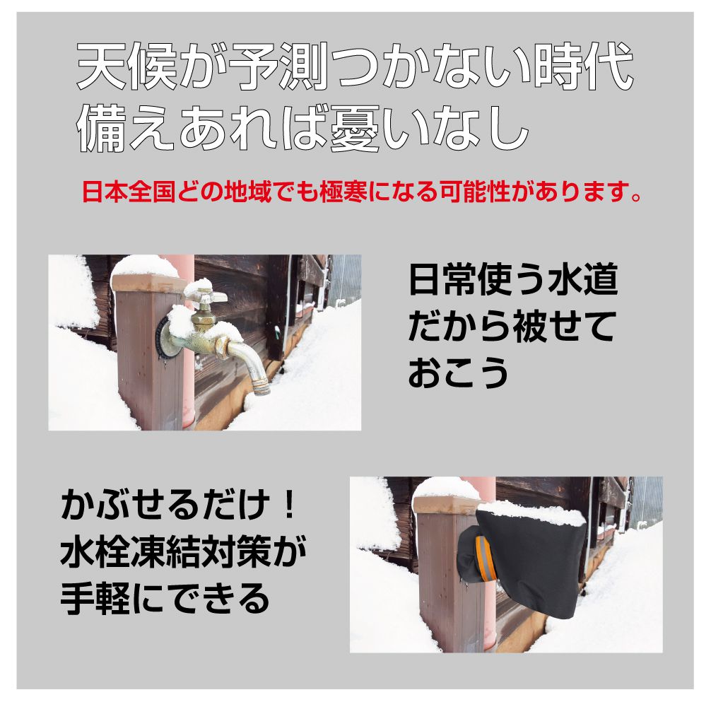 | 特徴 | ・冬場に起きる屋外の蛇口凍結を防止する高密度綿を使用した屋外水栓凍結防止袋です。 ・蛇口に被せるだけの簡単取付でお手軽に凍結防止ができます。 ・マジックテープ式なので付け外しも楽々♪ ・夜でも視認しやすい反射テープ付き。 ・420Dオックスフォード生地を使用しているので防水性も抜群です。 |