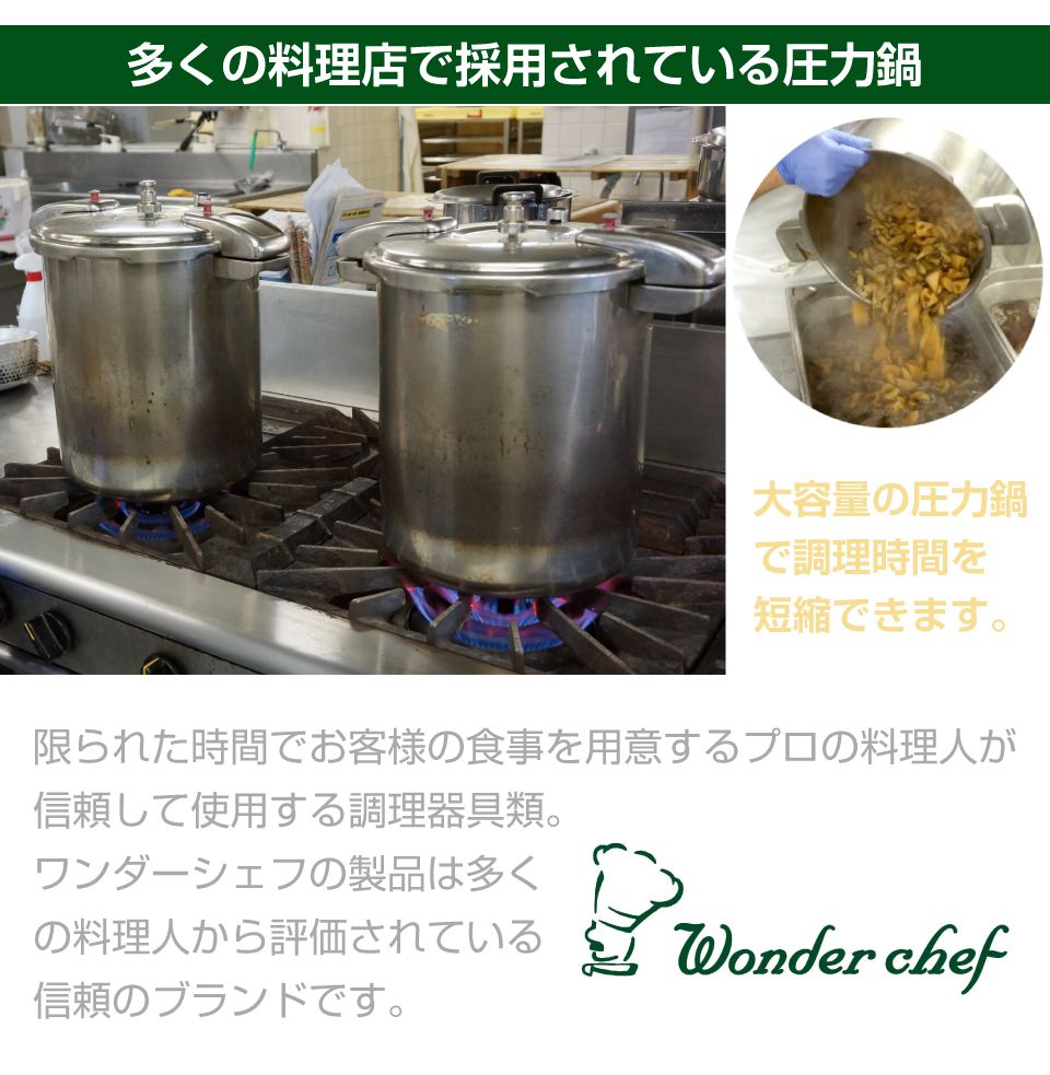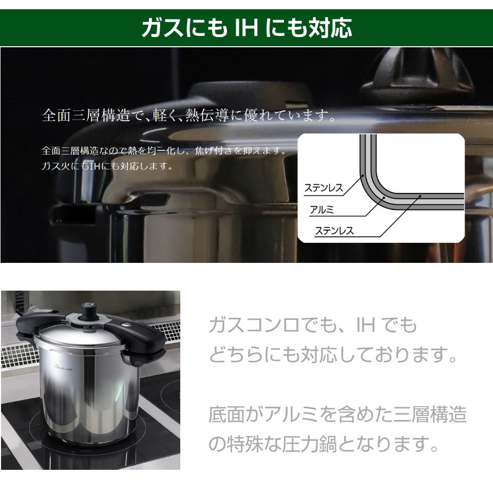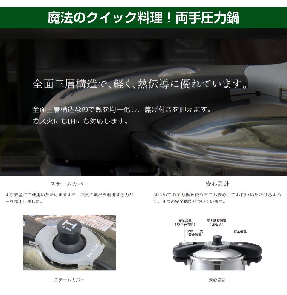 | 特徴 | 耐久性・安全性を重視したプロ用中型8リットル圧力鍋 魔法のクイック プロ仕様の超高圧力鍋! ・高温調理で、圧倒的な時短・柔らかさに ・超高圧140kPa(約2.4気圧)で圧倒的な調理スピード ・調理時間は約1/3、ガス代も約1/4に削減と、作業効率UPやコスト削減に <仕様と安心設計> 1.本体は全面三層構造。業務用対応の8.0L 2.全面三層構造で熱を均一化し、焦げ付きを抑えます 3.蒸気の噴出を制御するスチームカバーを採用 4.ガスレンジ・IH調理器ともに対応 |