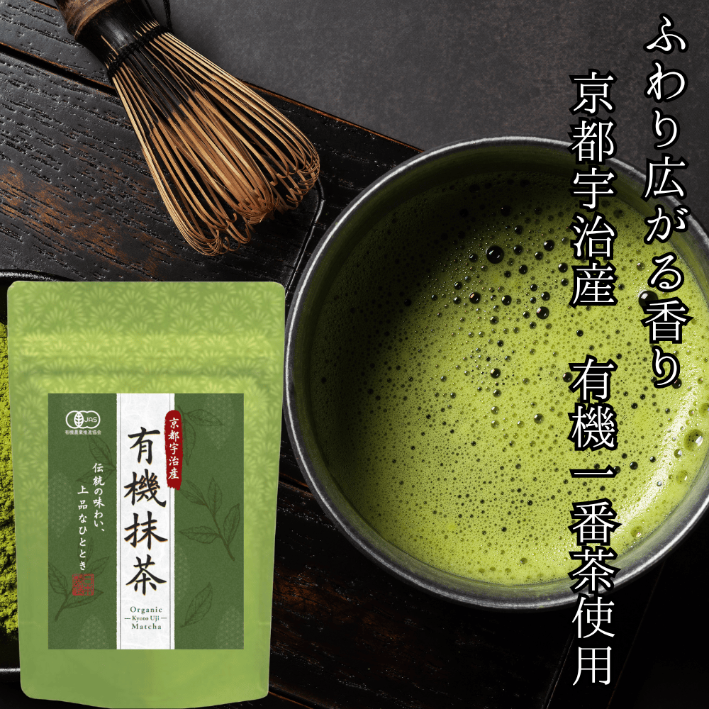 【京都府宇治産 一番茶100%使用】宇治の豊かな自然と伝統ある茶栽培技術により育まれた上質な茶葉の、もっとも香りと旨みが凝縮された「一番茶」だけを100%使用しています。茶匠が丁寧に厳選した新芽を用いることで、深くまろやかな旨み、すっきりとした渋み、そして目を引く鮮やかな翡翠色が生まれます。抹茶本来の甘みと上質な香りを存分にお楽しみいただける、まさに京都宇治ならではの本格抹茶です。【オーガニック抹茶】本品に使用している茶葉は、土壌づくりから大切に育てられた有機JAS認証のオーガニック茶葉です。自然の力を最大限に引き出す栽培方法により、茶葉が本来持つ豊かな香り・深い旨み・鮮やかな緑をそのまま楽しむことができます。お子さまからご年配の方まで、安心して続けられる品質にこだわりました。【本格的に楽しめる3つの飲み方】初めての方でも迷わずにお楽しみいただけるよう、抹茶の美味しい点て方をご用意しました。〈茶せんで飲む場合50cc〉ティースプーン1杯(約1g)を茶碗に入れ、少量のお湯で溶きながら50cc程度のお湯を注ぎ、泡がきめ細かく立つまで茶せんで混ぜれば、香り高い本格抹茶の完成。〈アイスで飲む場合100ml〉ティースプーン1/4杯に少し水を入れよくかき混ぜます。水を足し、かき混ぜてお飲みください。〈ボトルで飲む場合500ml〉ボトルに50〜1000mlの水を入れてください。ティースプーン1杯を入れよく振ってから水を足してさらに振ってからお飲みください。【抹茶の栄養を丸ごと摂取&管理栄養士監修レシピQRコード付き】カテキン、テアニン、ビタミンC、ミネラルなど成分をたっぷり含んでます。茶ラテ・アイス・シフォンケーキなど、日常に取り入れやすいアレンジレシピを管理栄養士が監修。QRコードから簡単にアクセスでき、初心者の方でも失敗しにくく、すぐに楽しめます。毎日のティータイムがさらに広がり、ご家族皆さまで活用いただける抹茶生活の強い味方です。【安心の国内製造(FSSC22000認証工場)】徹底した品質管理で製造。高鮮度を保つため、高温多湿・移り香に注意し、開封後はお早めに。「よくあるご質問(Q&A)」Q1. この抹茶は「宇治抹茶」ですか?A. 本品は「宇治抹茶」としての商標は使用していませんが、京都府内で伝統的な宇治地域の製法で仕上げた品質の茶葉を使用しています。仕入れ元が少量生産のため商標使用料を省き、品質はそのままにコストを抑えてご提供しています。香り・色味・旨みは遜色のない上質な風味です。使用している茶葉は、京都の豊かな自然環境で育まれ、上品な甘みと香ばしさを兼ね備えています。Q2. 春茶(しゅんちゃ)とは何ですか?A. 春茶(しゅんちゃ)とは、その年の新芽を最初に摘み取ったお茶のことです。春の限られた時期にしか採れず、茶葉に旨みや甘み成分(テアニン)が豊富に含まれます。本品はこの 春茶(しゅんちゃ)のみを100%使用しているため、香りが高く、苦味が少なく、まろやかな味わいをお楽しみいただけます。Q3. 抹茶の鮮度を保つ工夫や保存方法はありますか?A. 本品には「酸素レス(脱酸素剤)」を同梱しています。袋内の酸素を吸収し、抹茶の酸化・変色・風味の劣化を防ぐことで、開封まで新鮮な色と香りを保ちます。袋の中に小さなパックが入っていますが、食品用の安全なものですのでご安心ください。開封後はしっかり封をして冷暗所または冷蔵庫で保存し、湿気や光を避けると風味が長持ちします。使うたびに空気を抜いて密閉すると、さらに鮮度を保てます。Q4. 抹茶がダマになることがあります。どうすれば溶けやすいですか?A. 少量の水で先にペースト状に溶かしてからお湯やミルクを注ぐと、きれいに溶けます。シェイカーやミルクフォーマーを使うのもおすすめです。Q5. 苦味が強くありませんか?A. 本品は春茶(しゅんちゃ)100%を使用しており、甘みと旨みが強く苦味が少ないのが特徴です。そのまま飲んでも飲みやすく、ミルクとの相性も抜群です。Q6. お菓子作りにも使えますか?A. はい。抹茶スイーツやラテ、パンケーキ、アイスなど幅広くお使いいただけます。管理栄養士監修のレシピQRコードも同封していますので、初めての方でも本格的な抹茶スイーツを楽しめます。