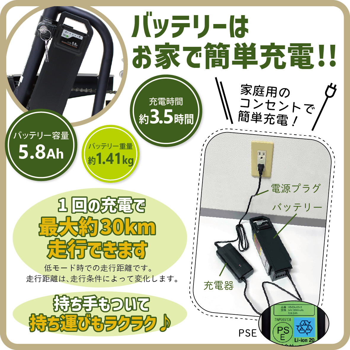 ●走行距離:低モード/約30km、中モード/約25km、高モード/約20km(充電1回分)