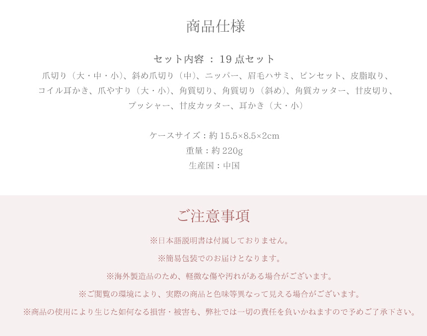爪切り(大・中・小)、斜め爪切り(中)、ニッパー、眉毛ハサミ、ピンセット、皮脂取り、