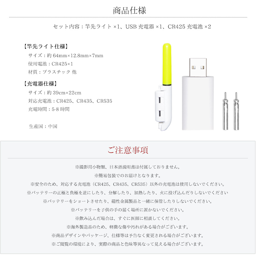 セット内容:竿先ライト×1、USB充電器×1、CR425充電池×2