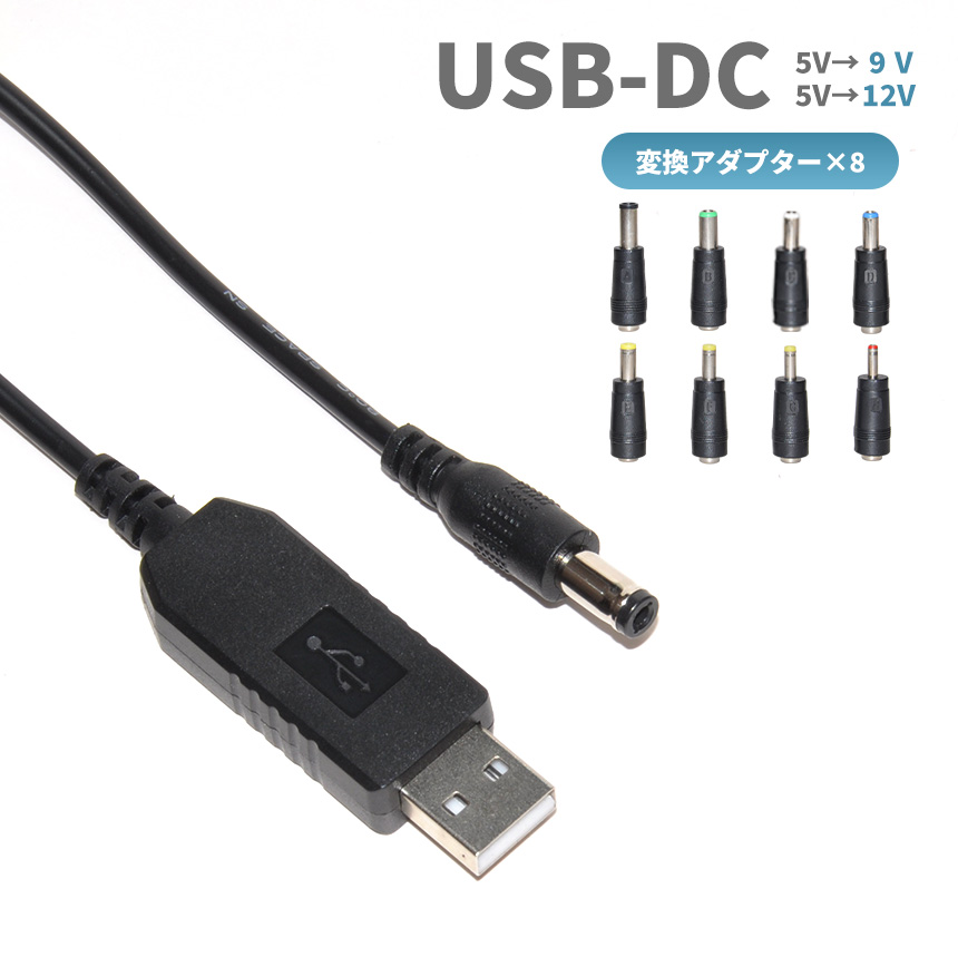 5Vから9V、5Vから12Vに変換できるUSB-DC昇圧ケーブルです。