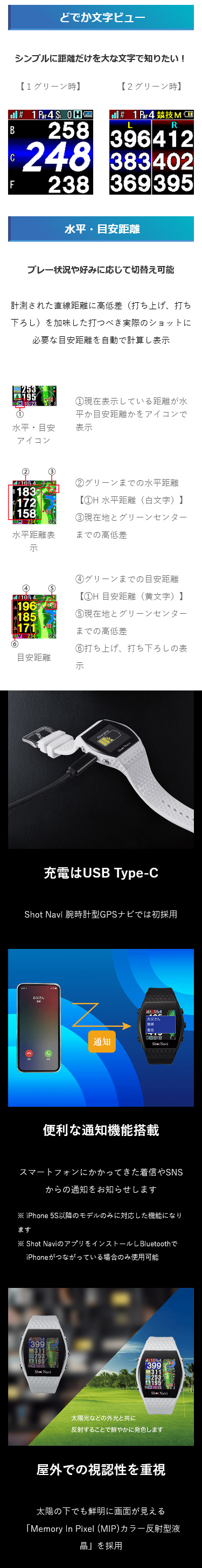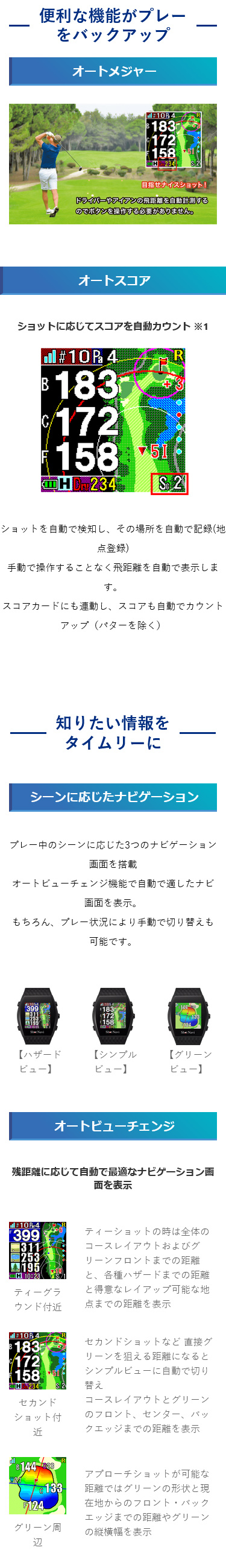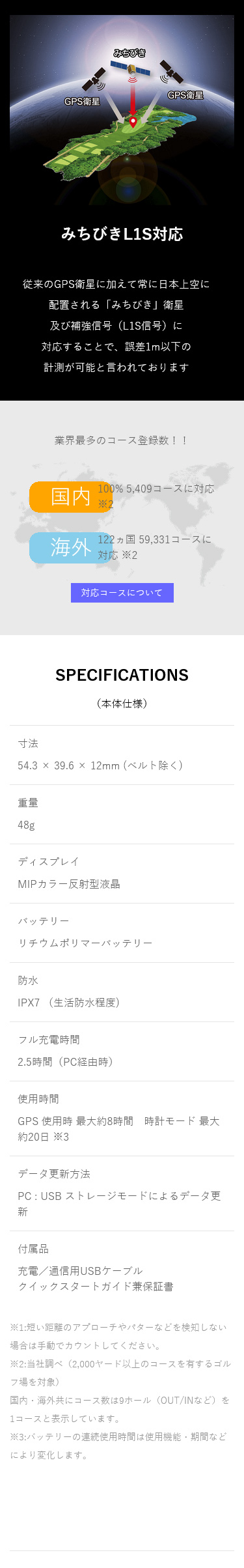 | 【本体仕様】 ■ディスプレイ:MIPカラー反射型液晶 ■バッテリー:リチウムポリマーバッテリー ■防水:IPX7(生活防水程度) ■フル充電時間:2.5時間(PC経由時) ■使用時間 GPS使用時:最大約8時間 時計モード:最大約20日 ※バッテリーの連続使用時間は使用機能・期間などにより変化します。 ■データ更新方法:PC USB ストレージモードによるデータ更新 ■通信:Bluetooth Smart 4.0 ■高精度測位みちびきL1S ■Green Eye ■コースレイアウト ■レイアップサークル ■フェアウェイナビ ■ピン位置表示 ■歩数計 ■オートメジャー ■ドライビングサークル ■オートビュー ■通知機能 ■飛距離計測 ■目安距離 ■推奨番手 ■同心円 ■スコアカード ■地点登録 ■ハザード表示 ■高低差 ■どでか文字 ■アプリ連動 ■競技モード ■海外対応 ■国内100%収録 ■Made in Japan | |