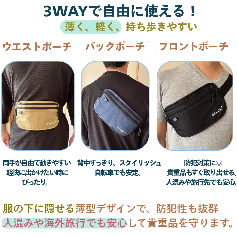 ウエストポーチ メンズ レディース スリム 薄型 軽量 撥水 旅行ポーチ 貴重品入れ 旅行用 セキュリティポーチ セキュリティポ パスポートポーチ ボディバッグ 腹巻き 防犯 斜め掛け ショルダーバッグ スキミング防止 RFID ブロック 海外旅行 出張 トラベルポーチ 貴重品ケース パスポートケース チケットケース スマホポーチ 財布 コンパクト おしゃれ シンプル 通勤 通学 散歩 ウォーキング フェス 防災 アウトドア ランニングポーチ ウォーキングポーチ 男女兼用 伸縮ベルト 調整可能 スポーツ 軽い バッグ 収納 整理整頓 3層構造 メッシュ 通気性 肌にやさしい 快適 旅行グッズ 便利グッズ プレゼント ギフト 旅行準備