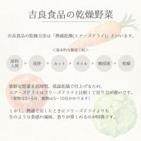新鮮な野菜を長時間、低温乾燥(約50〜70℃、6時間〜12時間)で仕上げるため熱湯で戻したとき生に近い状態になります。