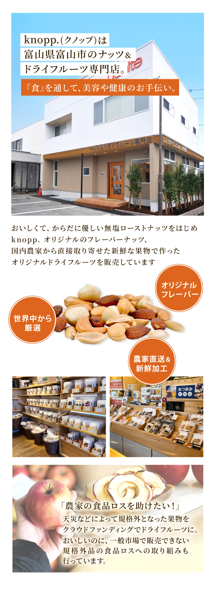 ナッツ&ドライフルーツ専門店 クノップ/knopp.とは2017年4月富山県富山市にオープンした富山県内初のナッツとドライフルーツの専門店です。世界中から厳選した素焼き無塩ナッツはもちろん、クノップが調合したオリジナルのフレーバーナッツ、日本国内の農家から直接仕入れた果物を幾度も試作を重ね完成したオリジナルドライフルーツなど、他店では味わうことのできない商品を取り揃えています。