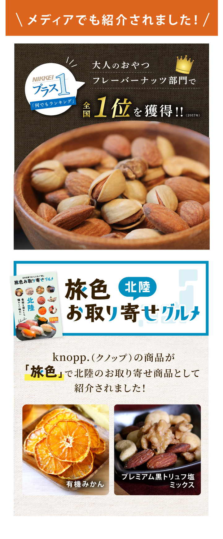 ■スモークミックス日経新聞 NIKKEIプラス1「なんでもランキング」の大人のおやつフレーバーナッツ部門にて、見事“全国1位” を獲得しました。燻製チップを特注して燻しているため、他では食べられない貴重な旨みのスモークミックスです。お酒にあう有塩ナッツをお探しの方や無塩では物足りない方へ、何度も試作を重ねて「ちょうどいい塩味」を実現しました。