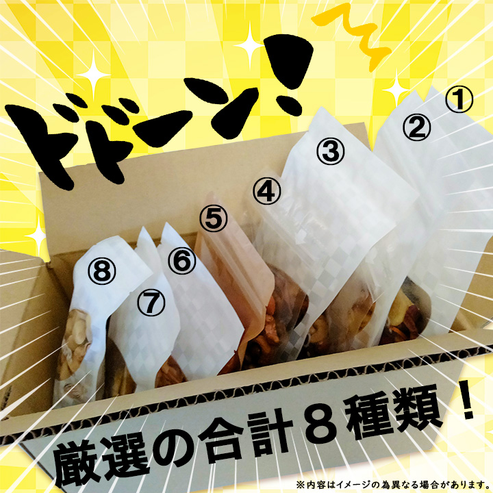 お楽しみ商品“例えば”こんなラインナップ・ナッツ商品:ナッツの恋人、岩塩ミックスナッツ、わさび黒大豆、素焼きローストミックスナッツ、各種燻製ナッツなど