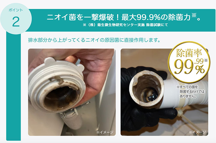 排水部分から上がってくるニオイの原因菌に直接作用します。