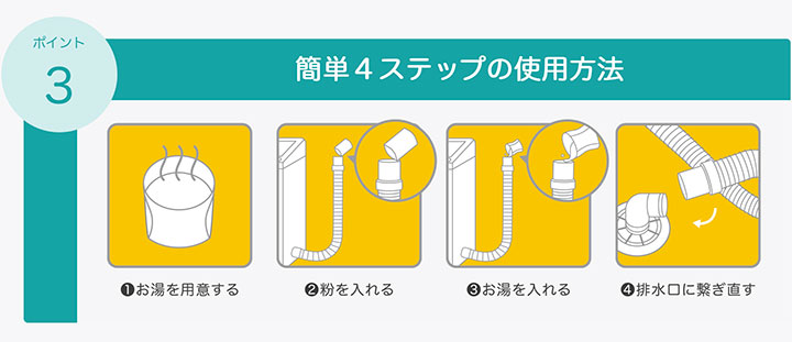 2.排水口側に接続されているホースを取り外し、先端を床から30cm程上げた状態で、本品を開封し投入してください。