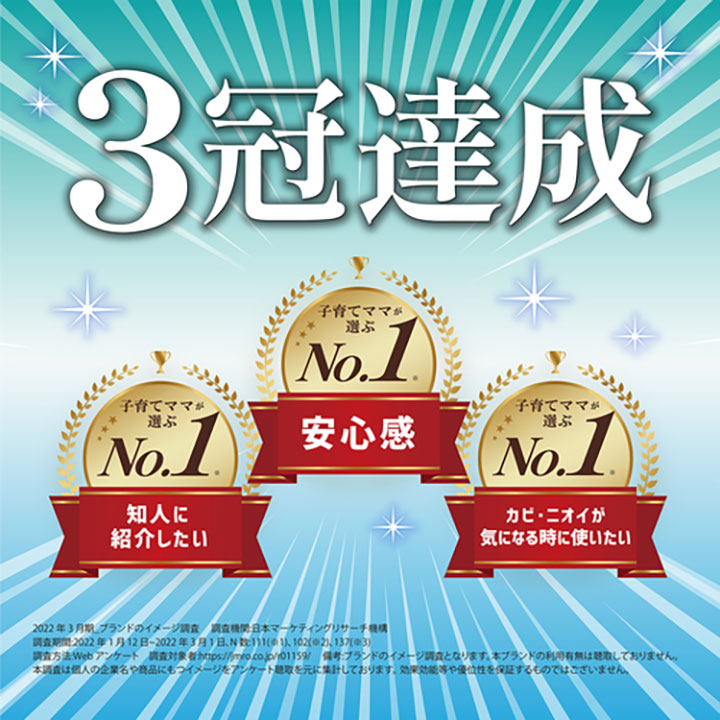 ・子育てママが選ぶ「知人に紹介したいNo.1」「安心感No.1」「カビ・ニオイが気になる時に使いたいNo.1」の3冠達成!