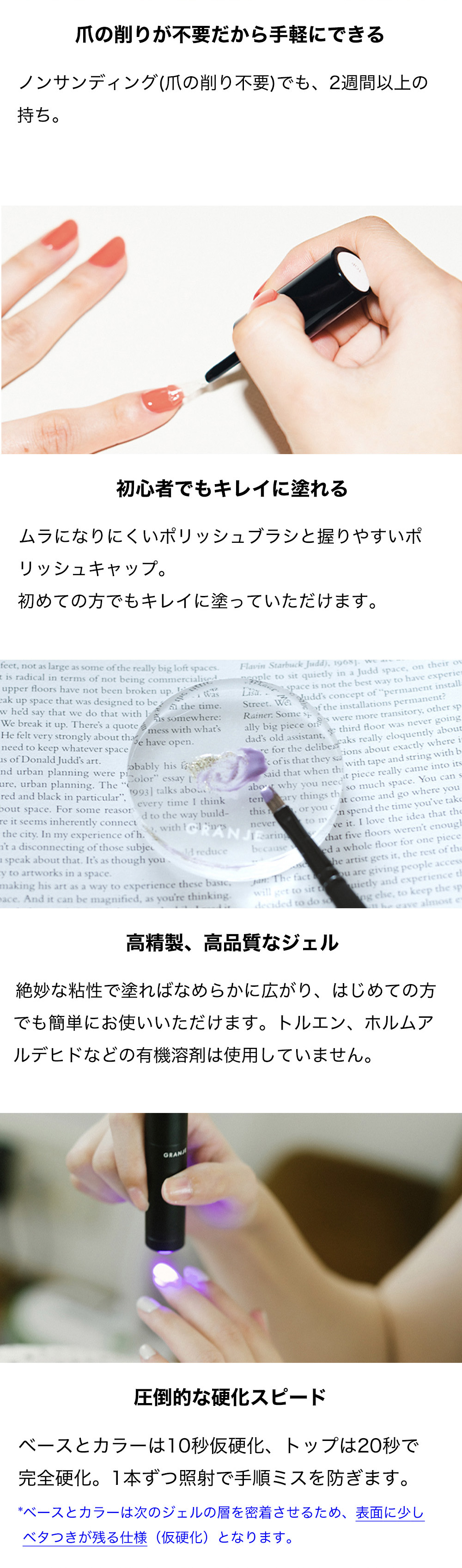 GRANJE グランジェ ジェル ネイル セルフネイル セルフネイルジェル ジェルネイル ジェルネイルオフ ジェルネイルセルフ セルフジェルネイル セルフジェルネイルキット ジェルネイルキット ジェルネイルセット ジェルネイルライト ジェルポリッシュ ポリッシュ マニキュア ペディキュア カラージェル クリアジェル ベースジェル トップジェル ベースコート トップコート オフィスネイル オフィスカラー デザインネイル メンズネイル ワンカラー 単色