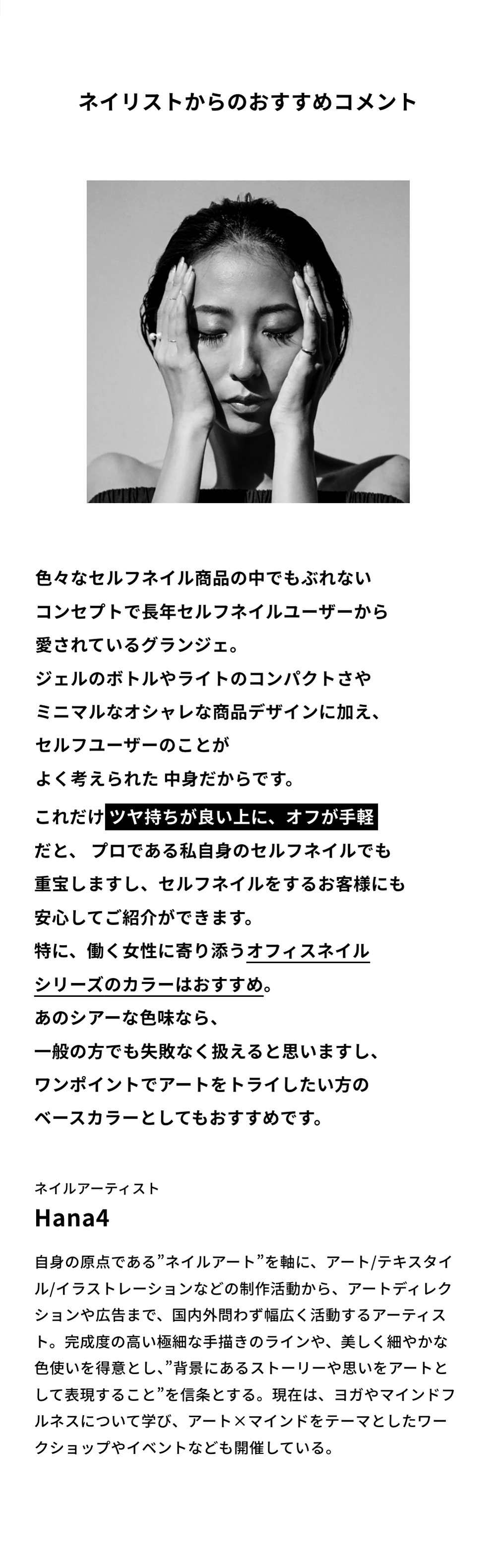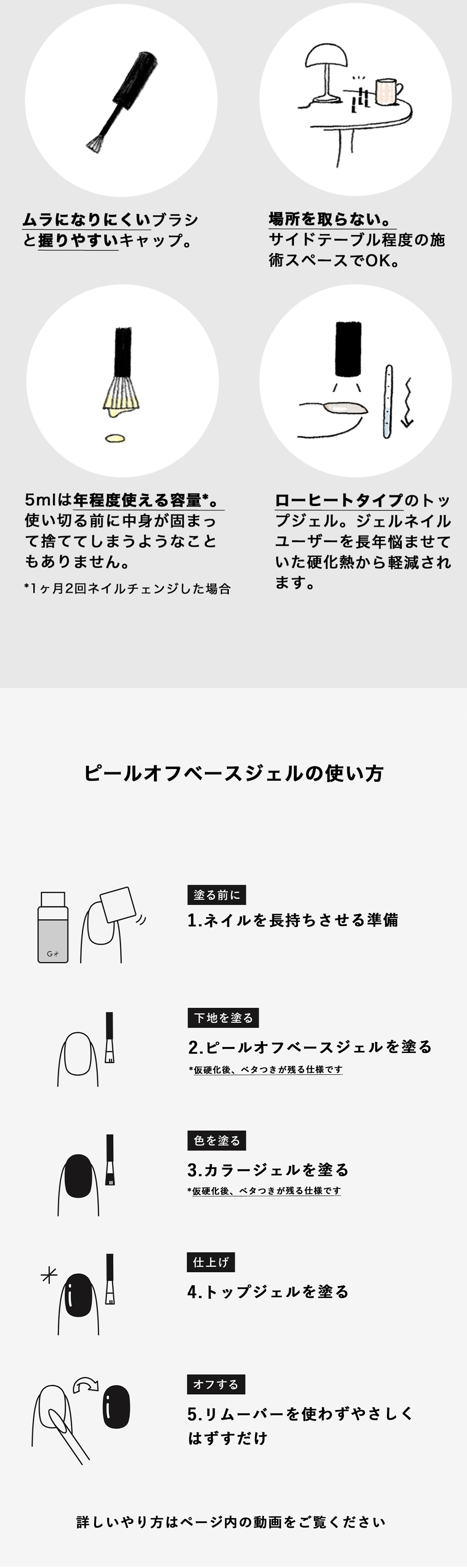 | 使用方法 | ジェルクリーナーで油分を拭き取った爪に直接塗り、ネイル硬化用ライト(ネイルキュアライト)を約10秒照射して仮硬化させます。 |