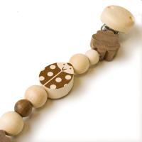 ビーズの先にある紐におしゃぶりをつけることが出来る木のおもちゃホルダーです。