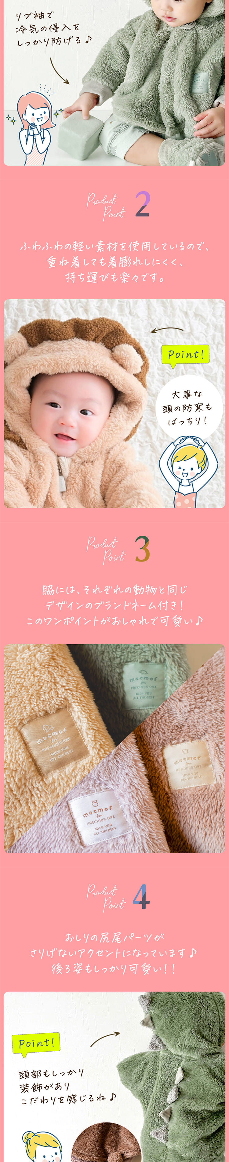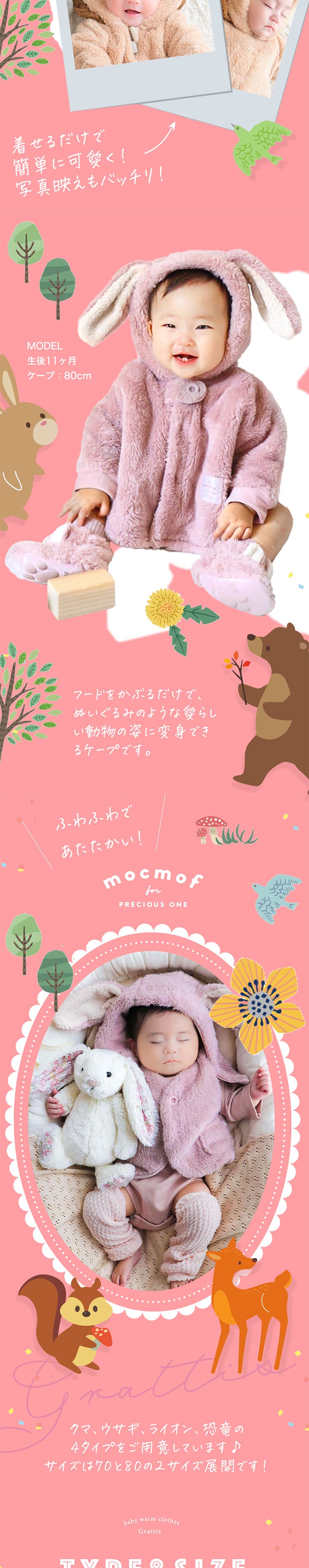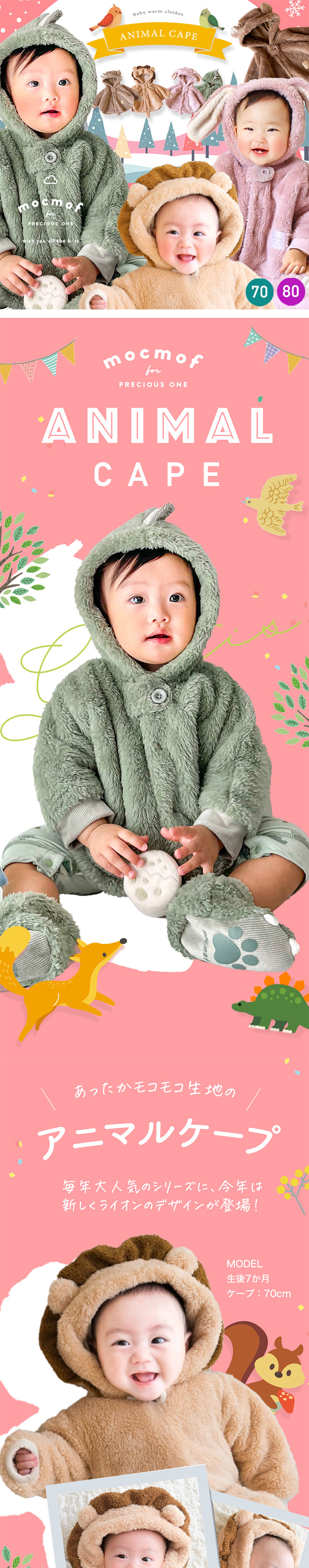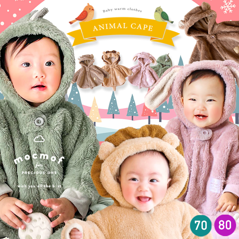 | 人気ブランド、mocmofから登場の秋〜春にぴったりの動物さんポンチョケープ♪ 男の子も女の子も楽しめるデザインで、ライオンやうさぎ、 怪獣などのかわいいなりきりスタイルが魅力のベビー服♪ もこもこの素材で暖かく、寒いお外のお出かけ時やベビーカーの中でも 赤ちゃんを優しく包み込みます♪ おしゃれなデザインはハロウィンやクリスマス、年賀状や、帰省時、お誕生日など特別な日にもぴったり♪ 70cmと80cmのサイズ展開で、赤ちゃんの成長に合わせて選べます。 寒い季節のお出かけに最適なベビーアウターです♪ 自身のお子様へはもちろん、ご友人や同僚、上司や部下、取引先のお客さん、 お孫さん、娘さん、甥っ子や姪っ子などへのちょっとしたプレゼントや贈り物、 プチギフト としても喜ばれる子供のあったかポンチョでございます。 |