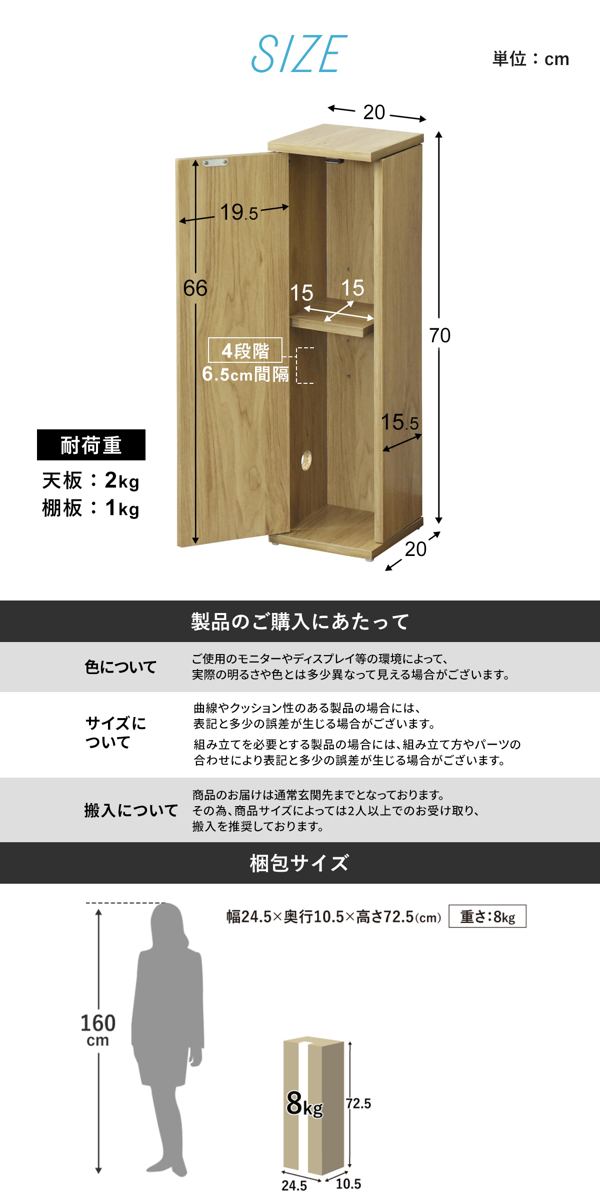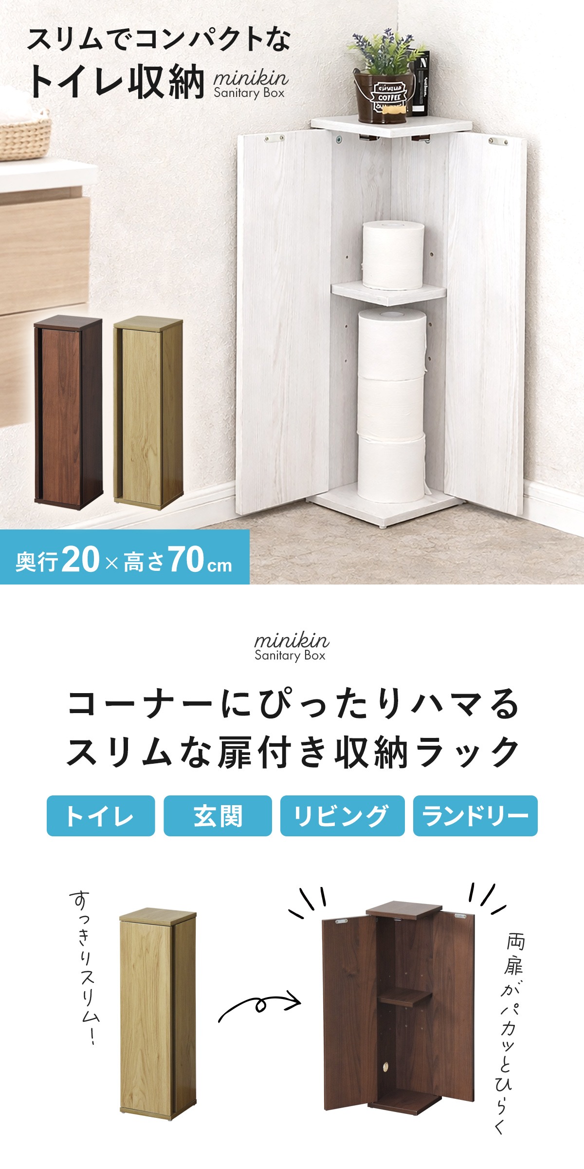 ミニキンは幅20cm×奥行20cm×高さ70cmのコンパクトサイズで、コーナーにぴったり収まるスリムな収納ラックです。スペースが限られるトイレにもスマートに設置でき、トイレットペーパーやサニタリーグッズなどのちょっとした収納に大活躍します。