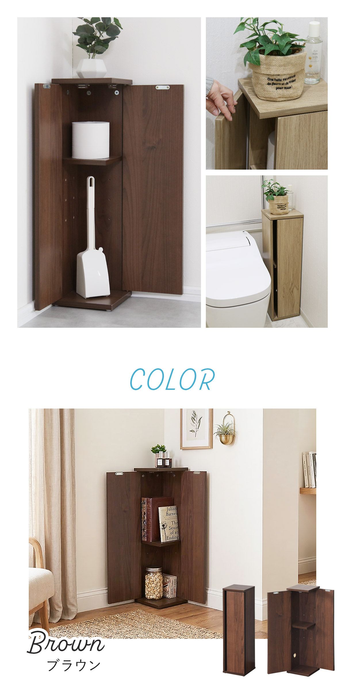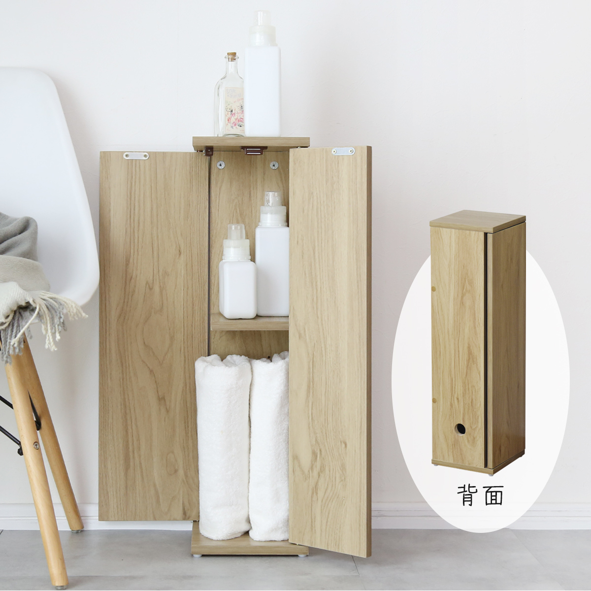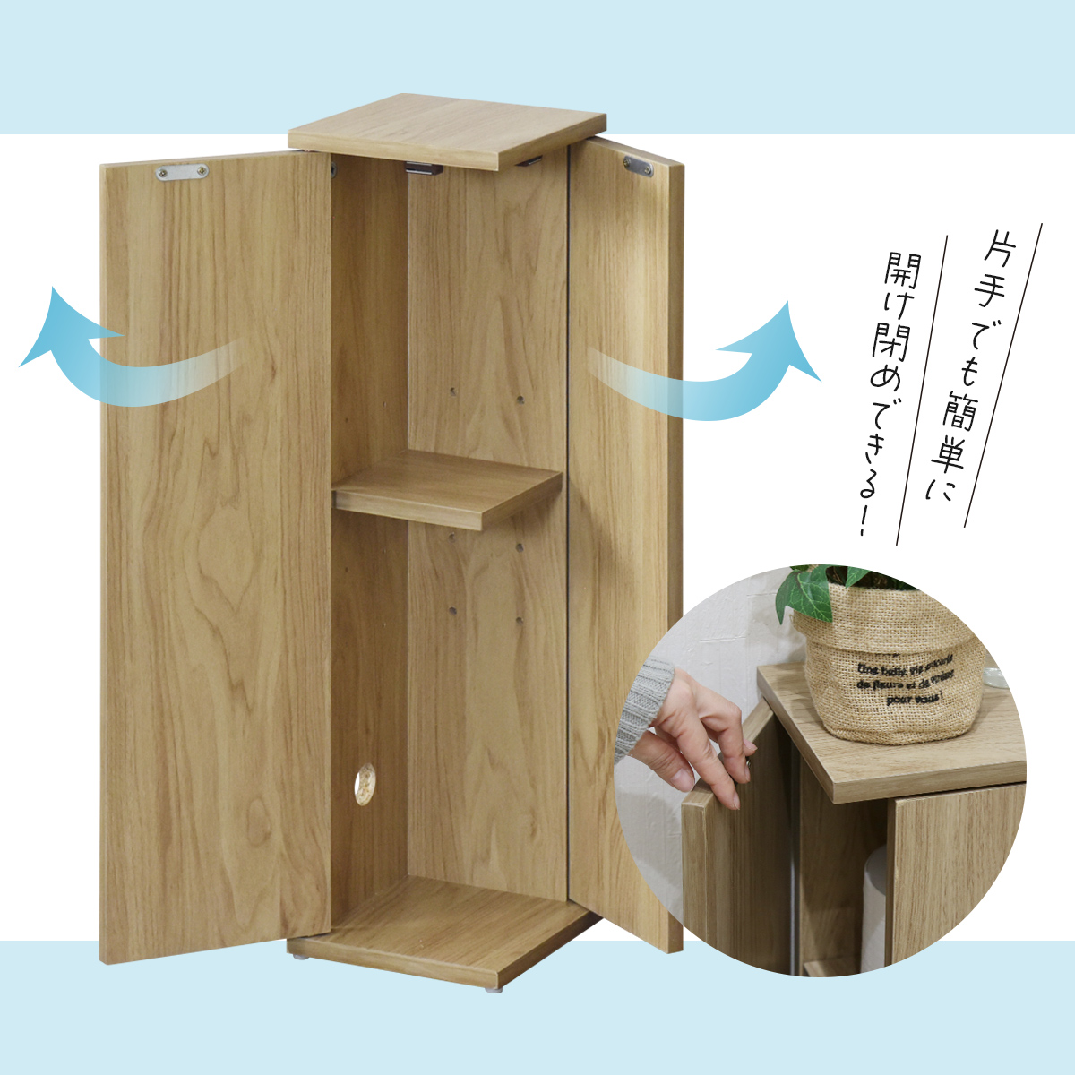 コーナーに設置しても開けやすい両開きの扉が付いており、中の物が取り出しやすく、使い勝手も抜群です。必要なものがすぐ手が届く場所に置けて、トイレットペーパーの交換や収納物を取り出す際も片手でパカッと開けられるのでストレスフリーでご利用いただけます。