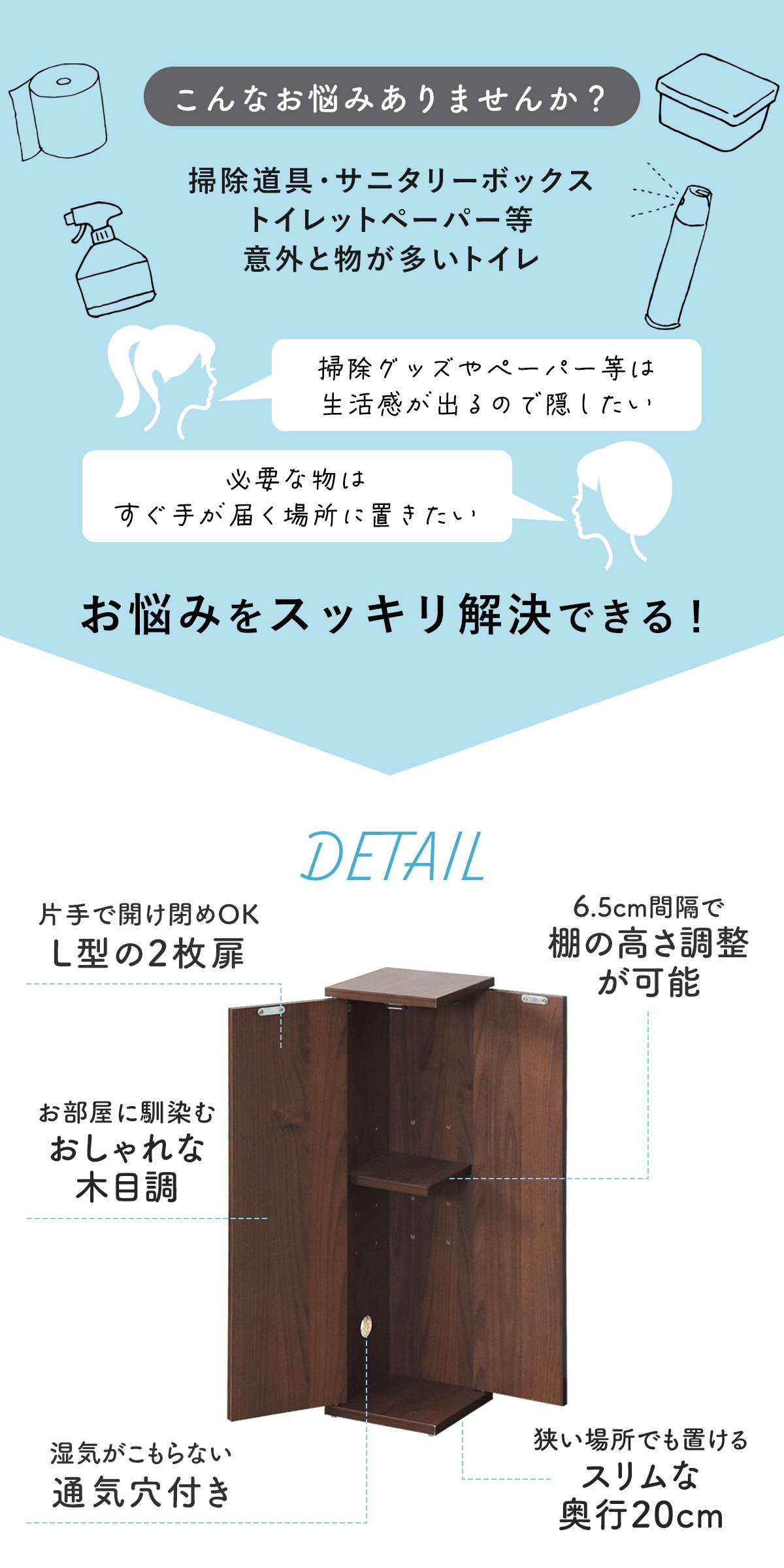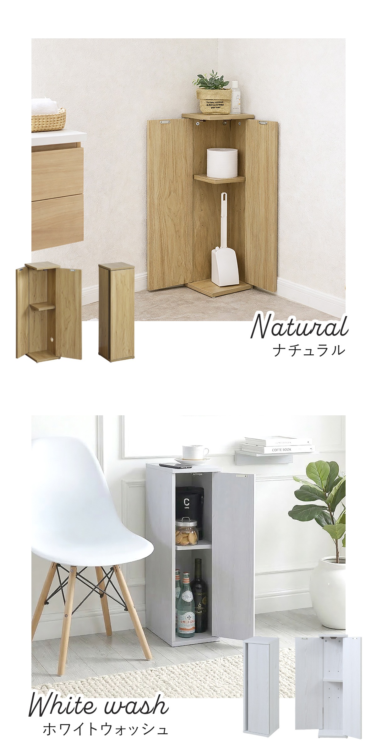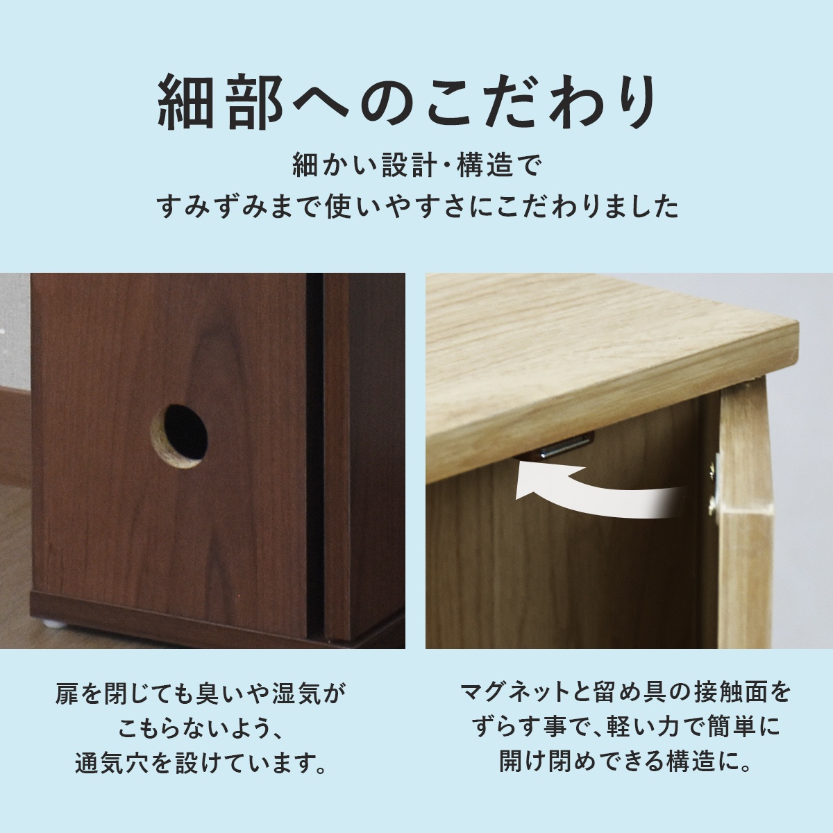 コーナーに設置しても開けやすい両開きの扉が付いており、中の物が取り出しやすく、使い勝手も抜群です。必要なものがすぐ手が届く場所に置けて、トイレットペーパーの交換や収納物を取り出す際も片手でパカッと開けられるのでストレスフリーでご利用いただけます。