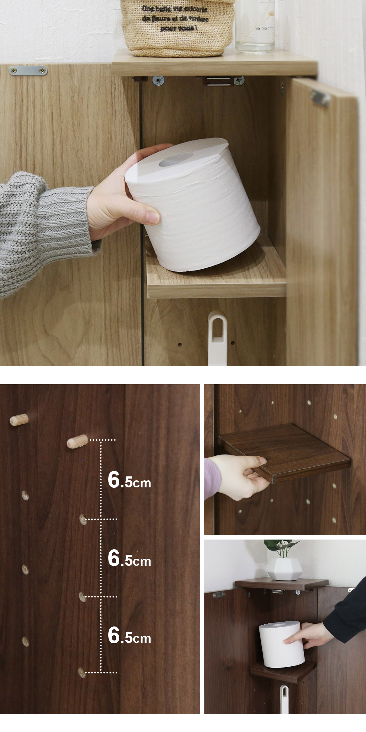 6.5cm間隔で4段階調整できる可動棚が付いているので、上段下段のスペースをお好みで調整できます。トイレットペーパーの他にもお掃除グッズやスプレーなど背の高いアイテムもスマートに収納できます。
