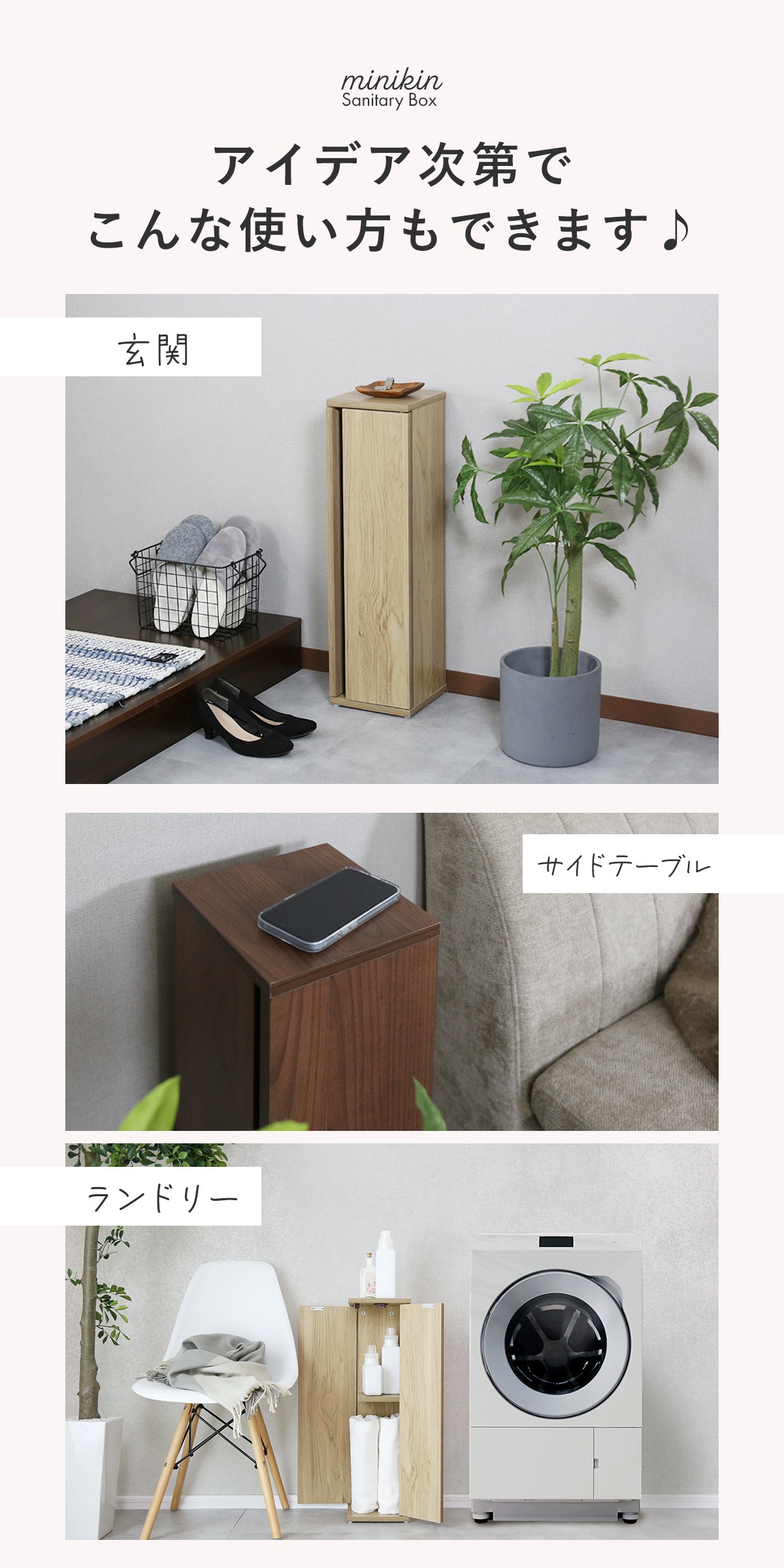トイレ収納はもちろん、玄関・リビング・サイドテーブル・ランドリーなど様々な場所でご利用いただけます。すぐ手の届くところに置きたいアイテムは、ミニキンに収納してスッキリおしゃれに!コンパクトだから置き場所を選びません。